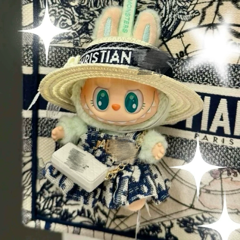 Elevate your Labubu doll’s style with this charming handmade clothes set. Featuring a chic straw hat, a blue and white patterned dress, and a delicate white bag. The hat adds a unique touch with ‘CHRISTIAN’ detailing. Perfect for collectors seeking distinctive and fashionable outfits for their Labubu figures.