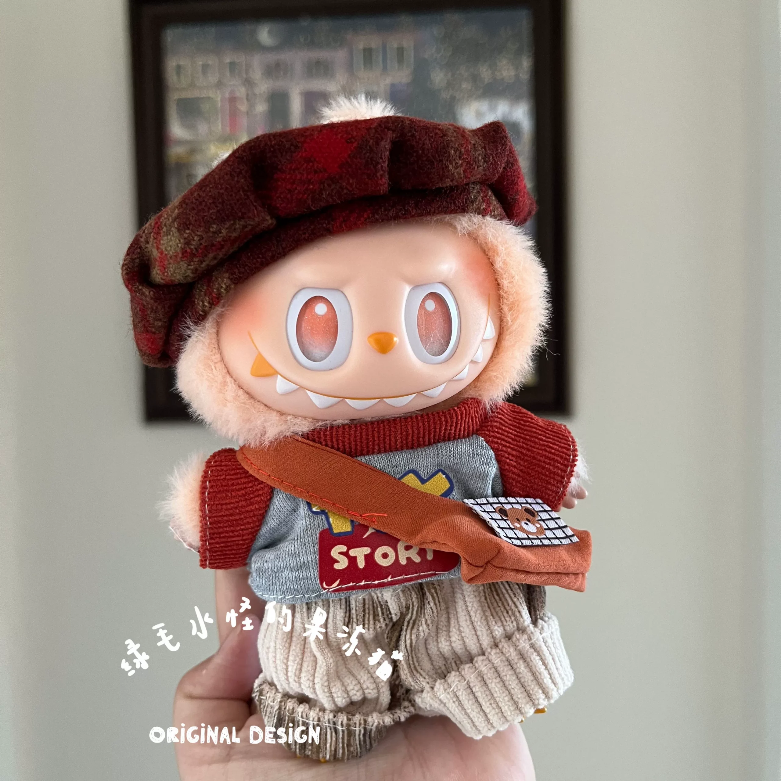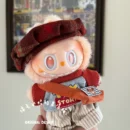 Dress your Labubu doll (suitable for 1st, 2nd, and 3rd generation) in this retro-inspired outfit featuring a plaid beret, grey top, beige shorts, and a small shoulder bag. Perfect for a stylish vintage look. (Note: Doll not included).