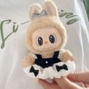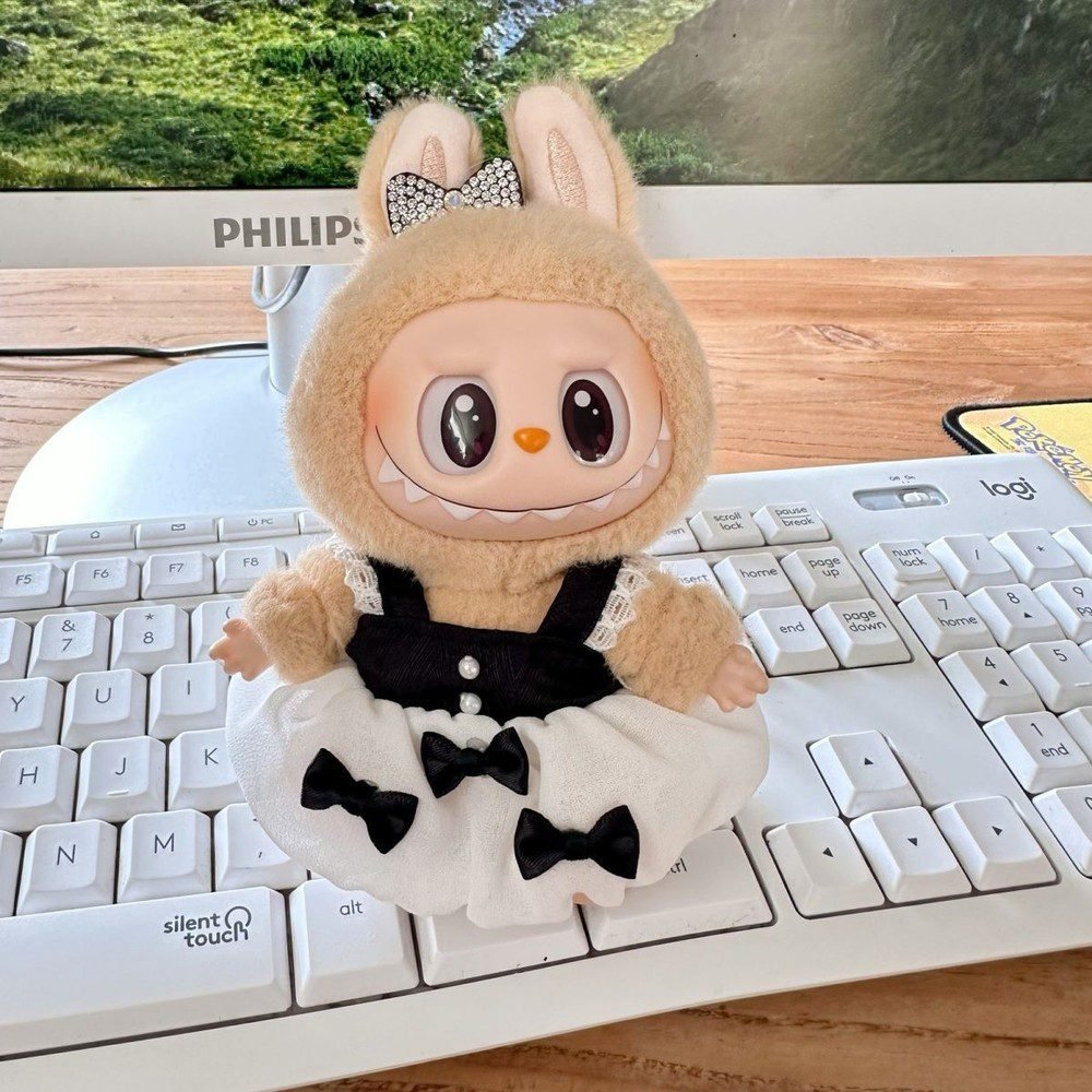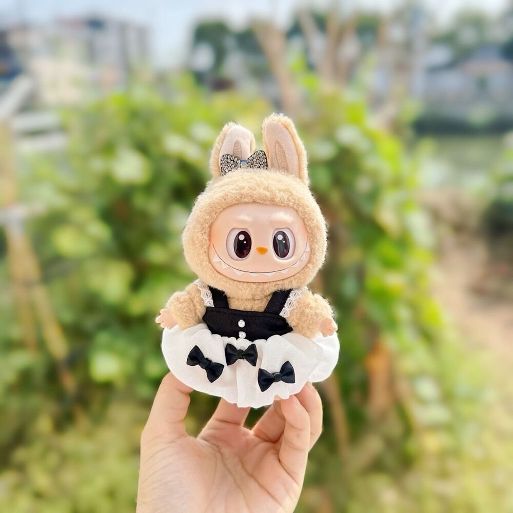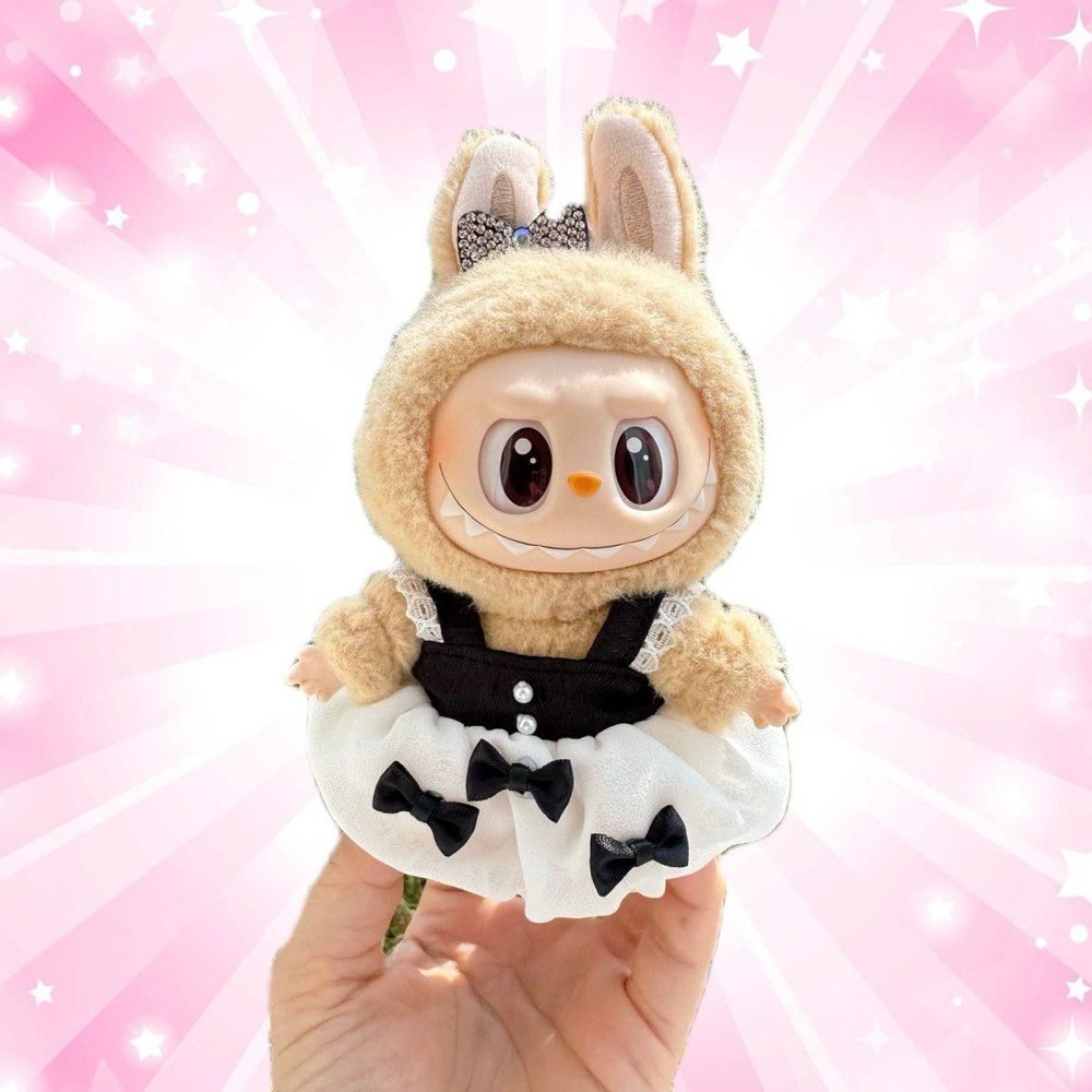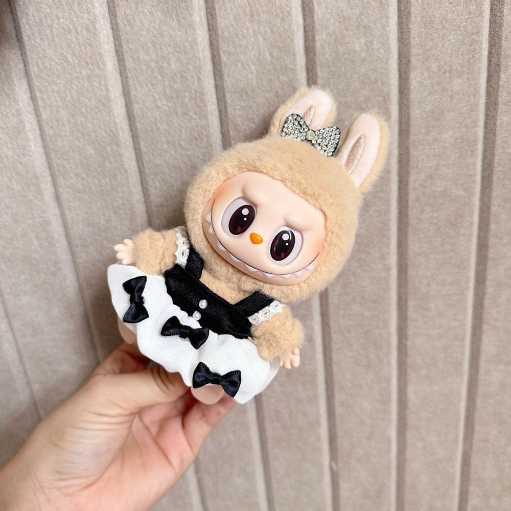 Dress your Labubu doll in this elegant handmade black and white dress, featuring a charming bow and a matching headband. This stylish outfit is perfect for a sophisticated and cute look. Clothes only, doll not included.