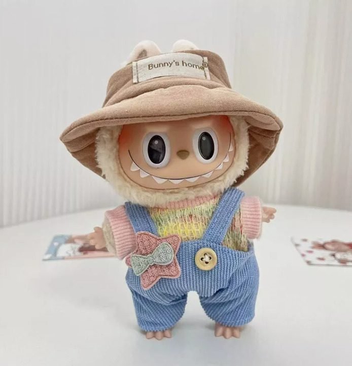Dress your Labubu doll in this charming handmade set featuring blue corduroy overalls, a colorful knitted top, and a cute bunny-eared bucket hat. Perfect for a playful and stylish look. Clothes only, doll not included.