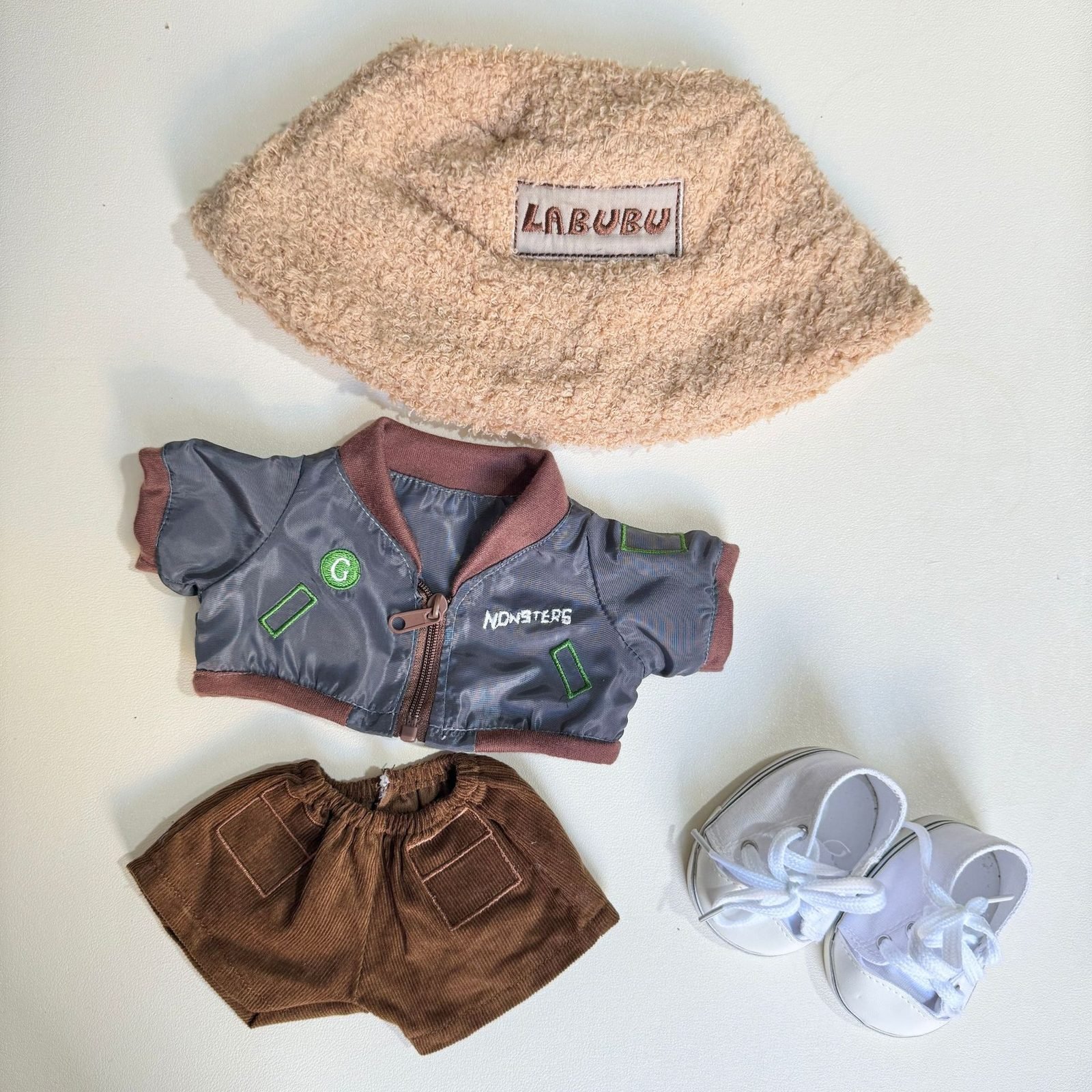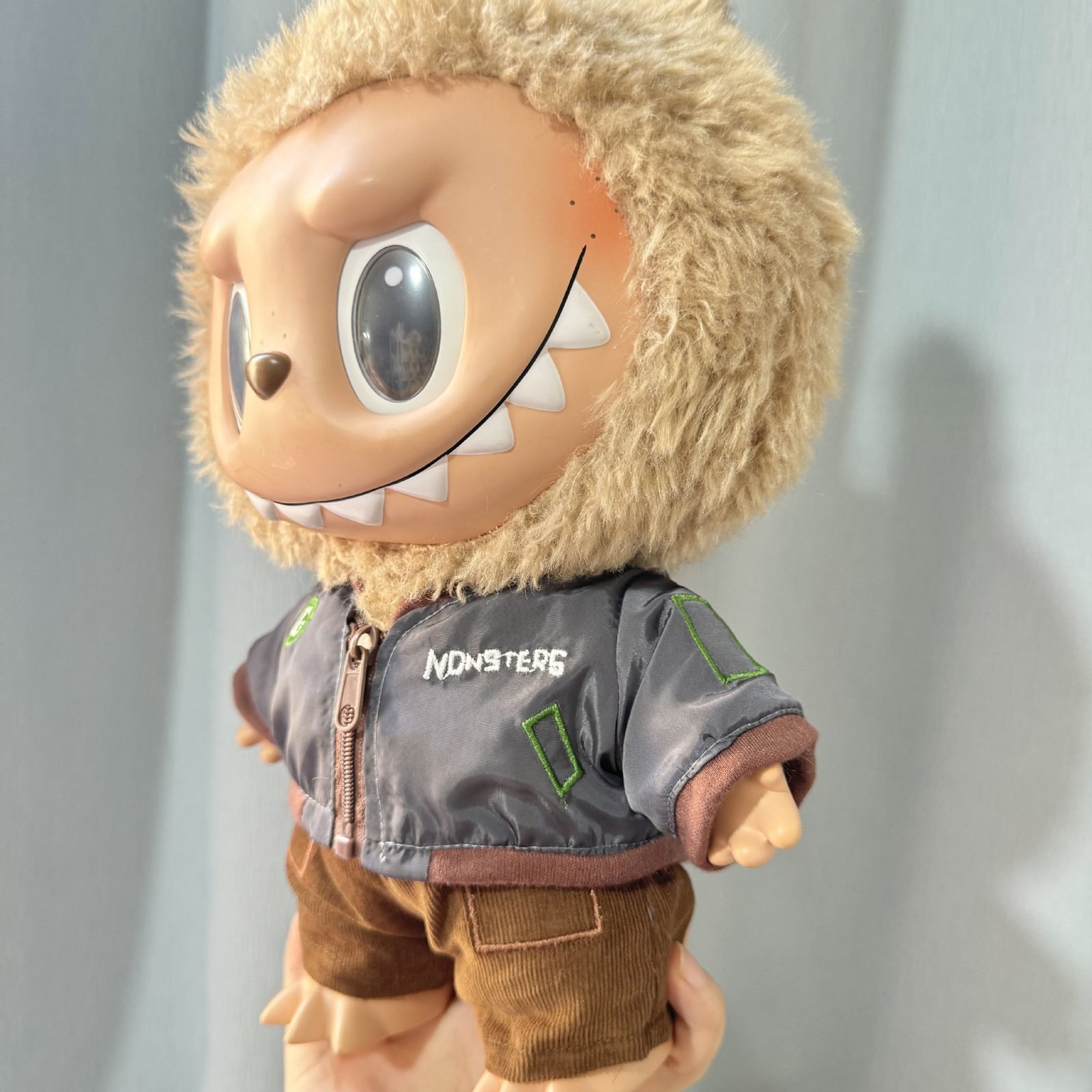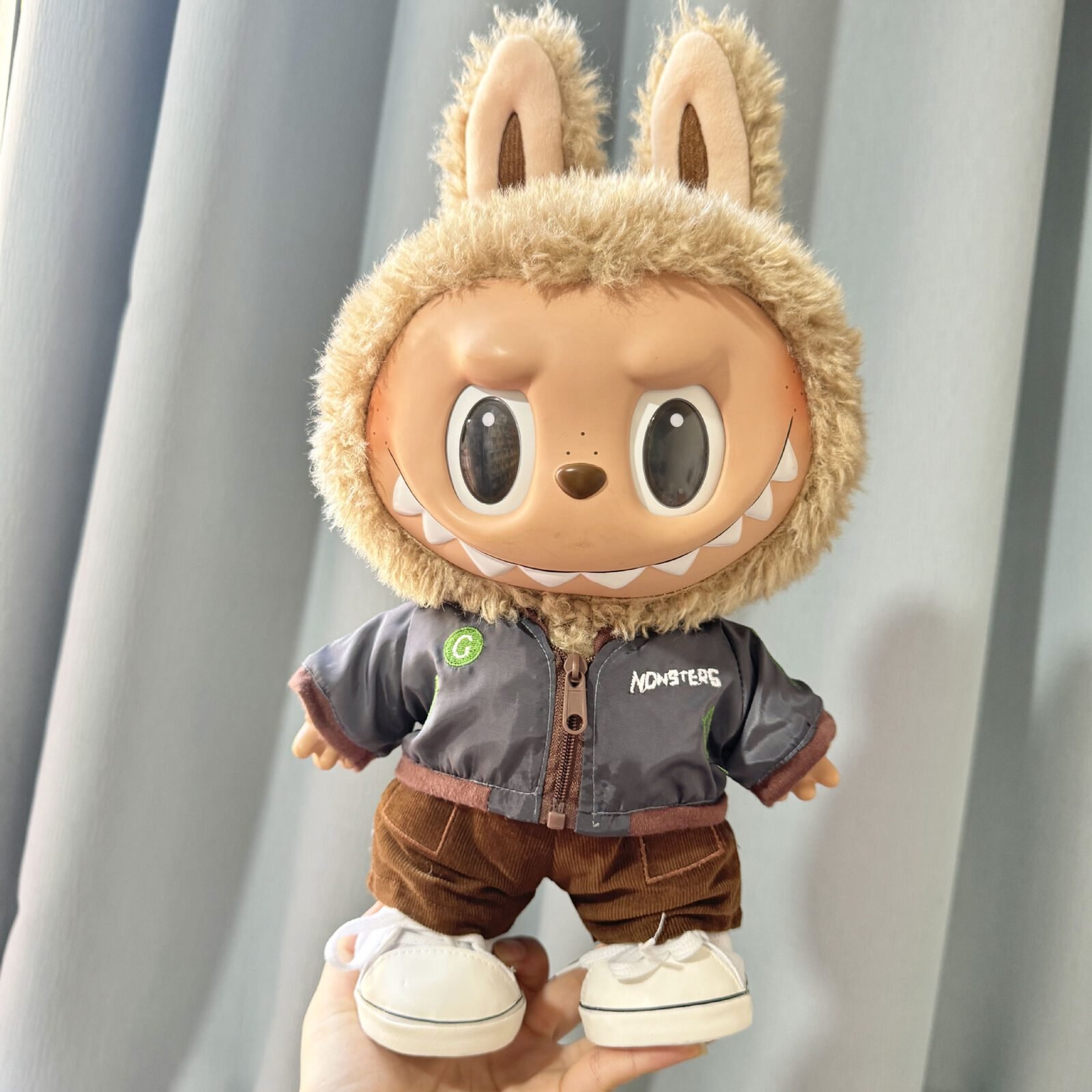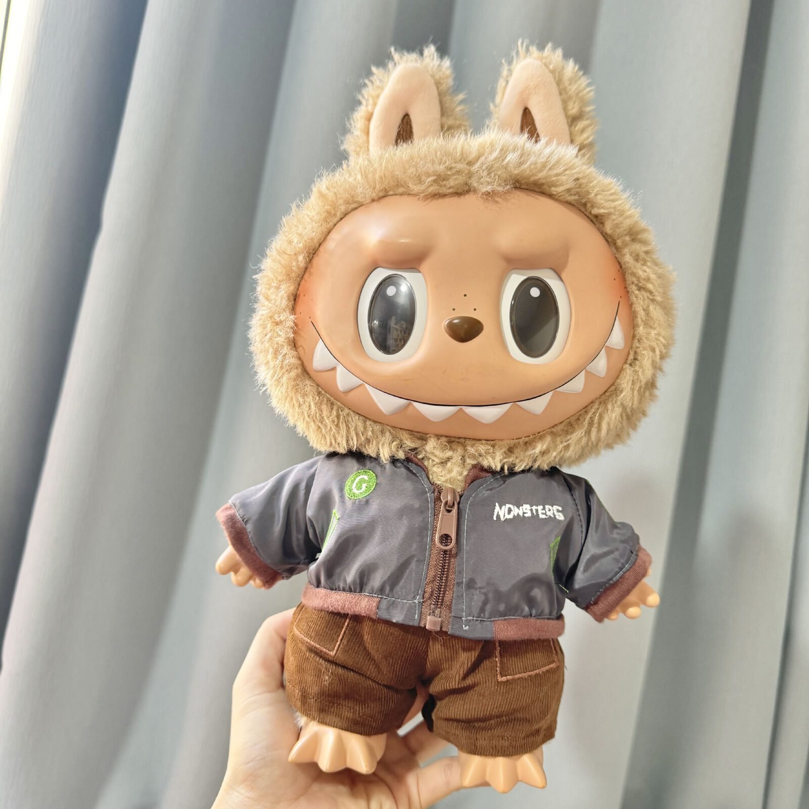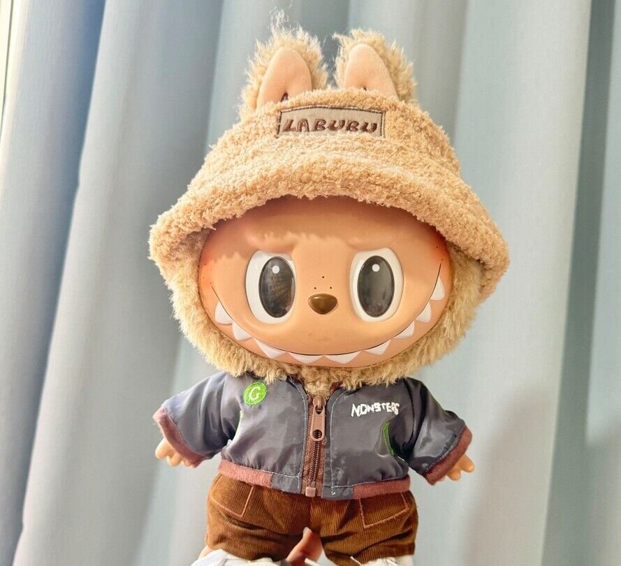 labubu-38cm-plush-doll-cool-grey-jacket-2-piece-set Description: Style your 38CM Labubu plush doll with this cool grey jacket two-piece set! It includes a jacket and pants, with optional hat and shoes, giving your Labubu a personalized look. Please note, the product only includes clothing, not the doll. Meets GMC requirements.