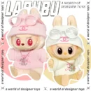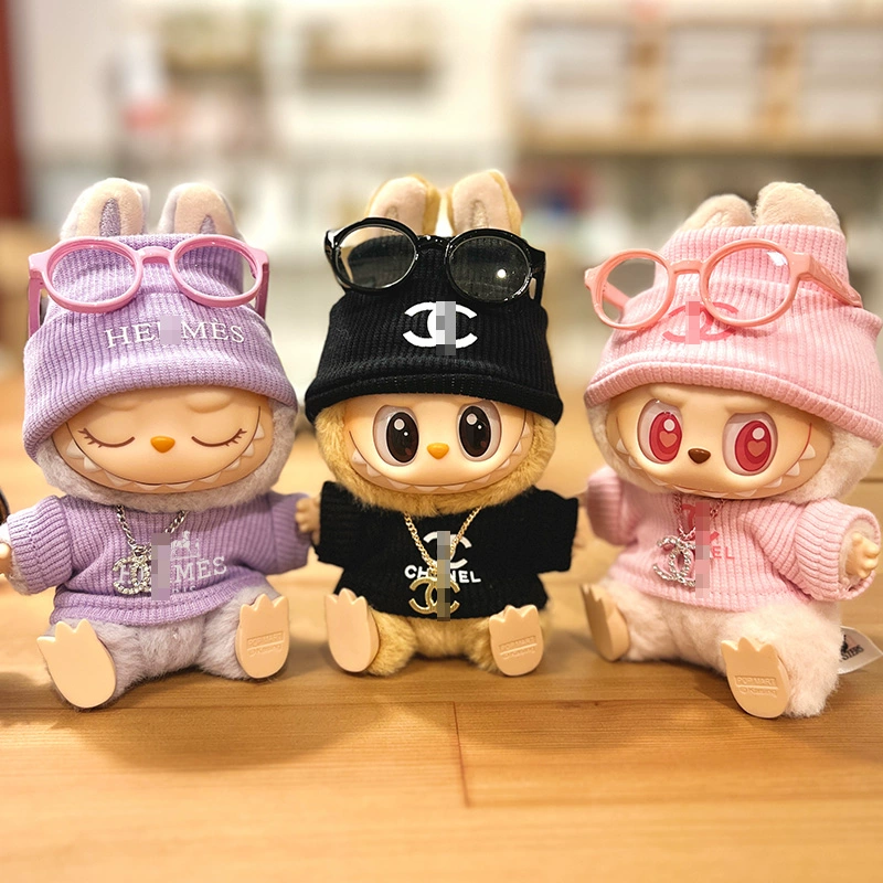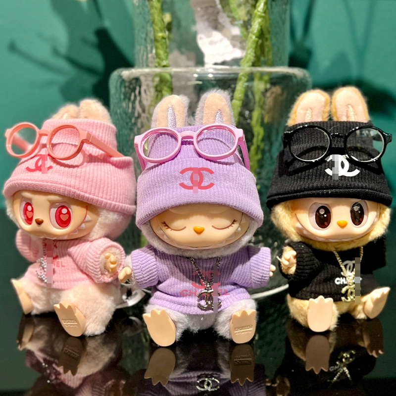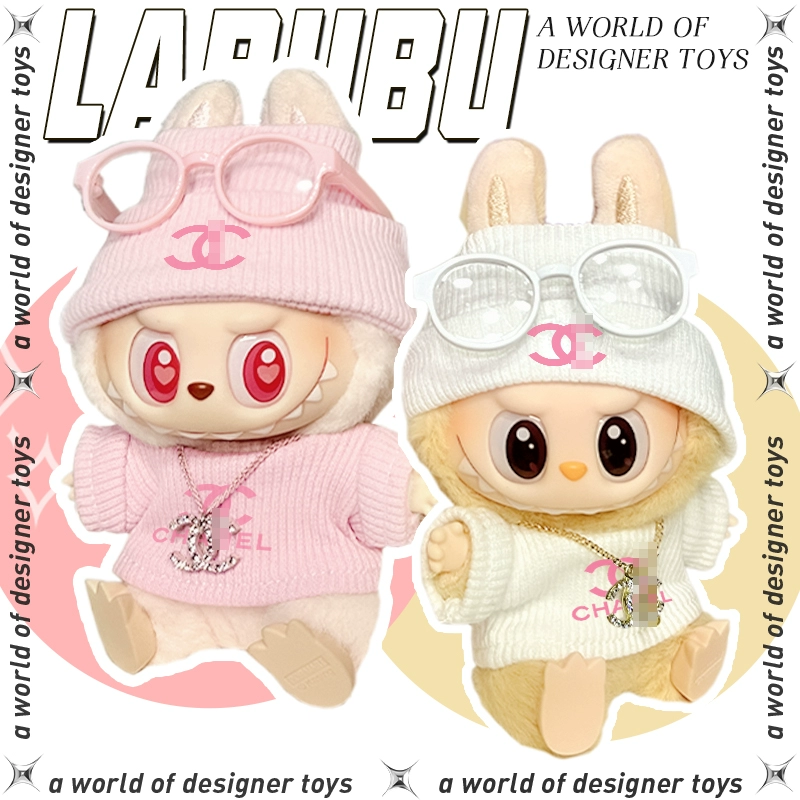 Adorn your Labubu dolls in these elegant Chanel-style sweater sets. Choose between a charming pink sweater with pink glasses and a silver necklace, or a classic white sweater with white glasses and a gold necklace. Both sets feature a Chanel-like logo and beanies with adorable rabbit ears, perfect for a sophisticated and cute look.