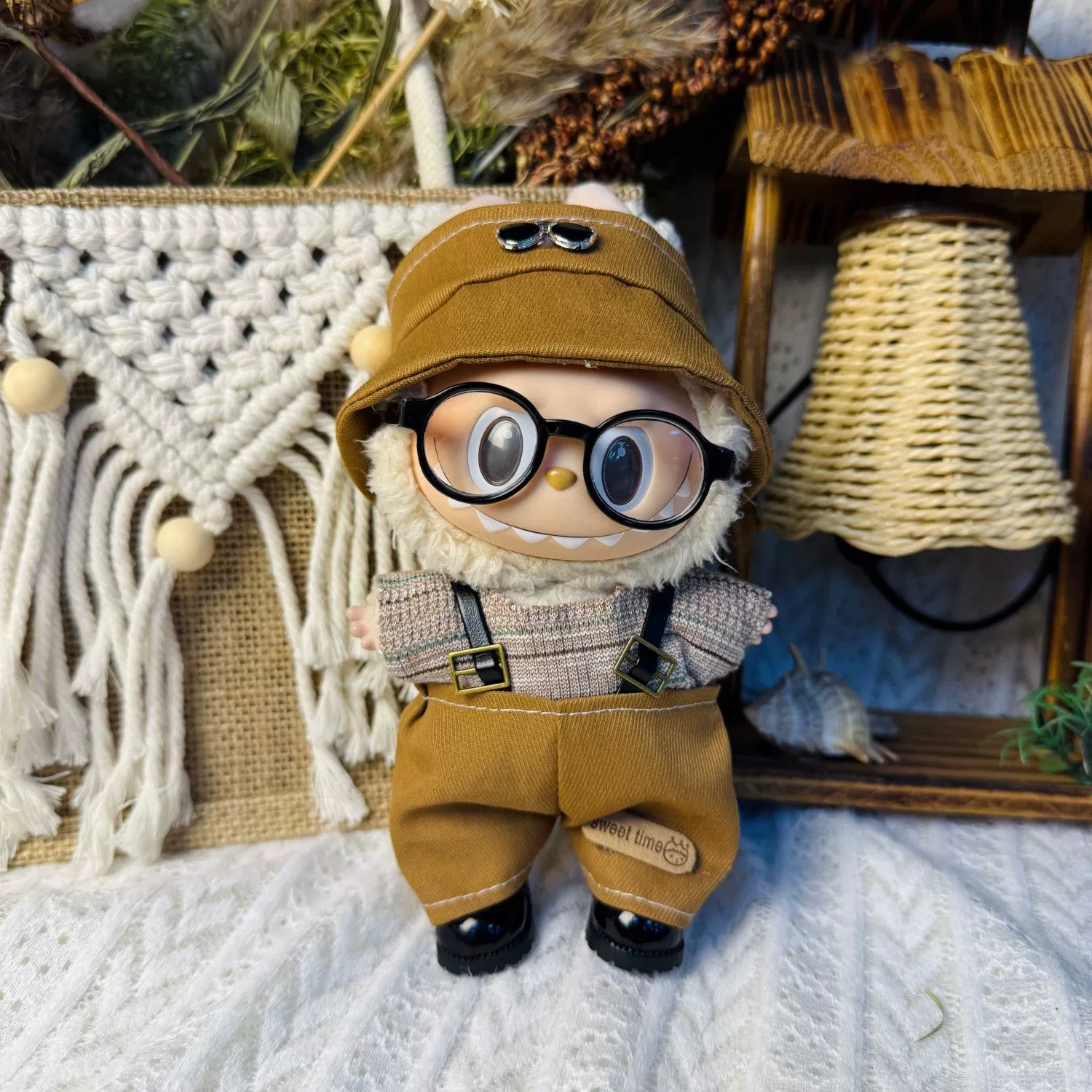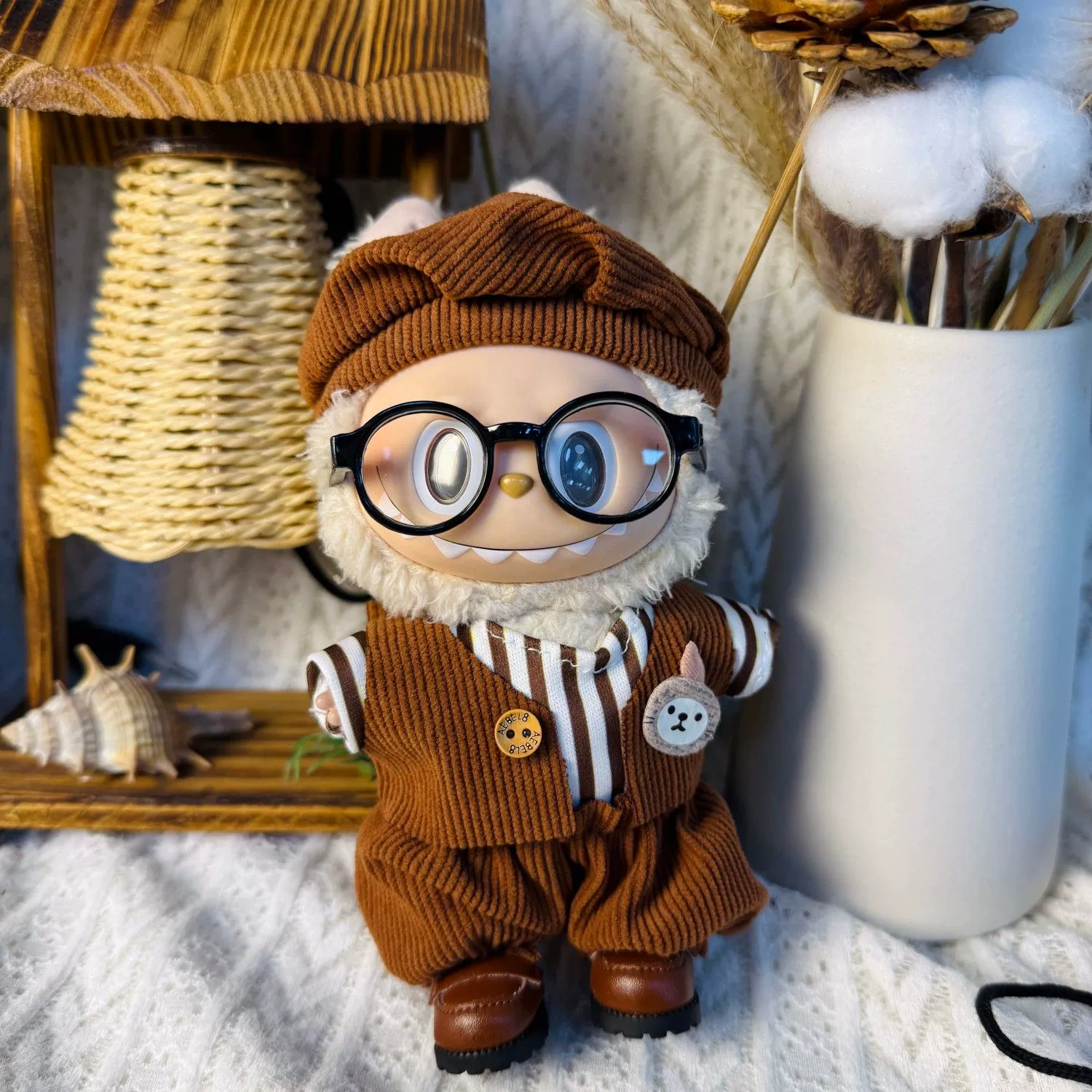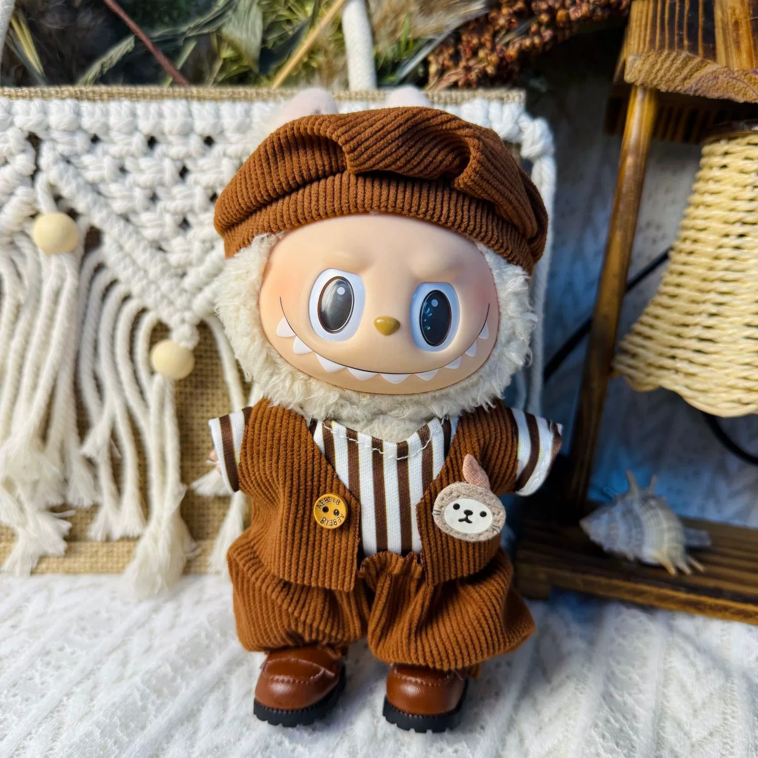 This handmade Labubu clothes set offers two distinct styles: a four-piece coffee corduroy vest set with a striped shirt, hat, and cute rabbit brooch, and an Old Qianfeng-inspired three-piece overall set with a beige sweater, hat, and glasses. Both designed to fit 17cm Labubu figures (Gen 1, 2 & 3). Perfect for giving your Labubu doll versatile and charming looks. Ships in 1-3 business days with guaranteed delivery within 7-15 days.