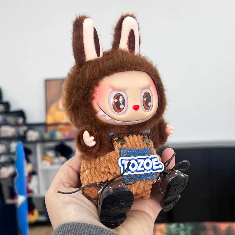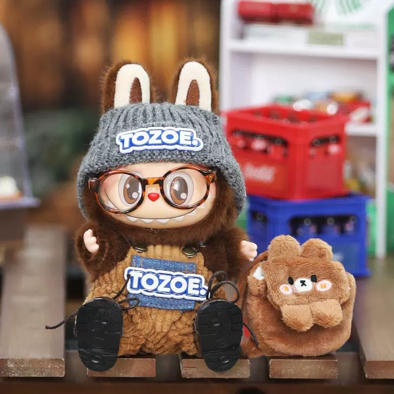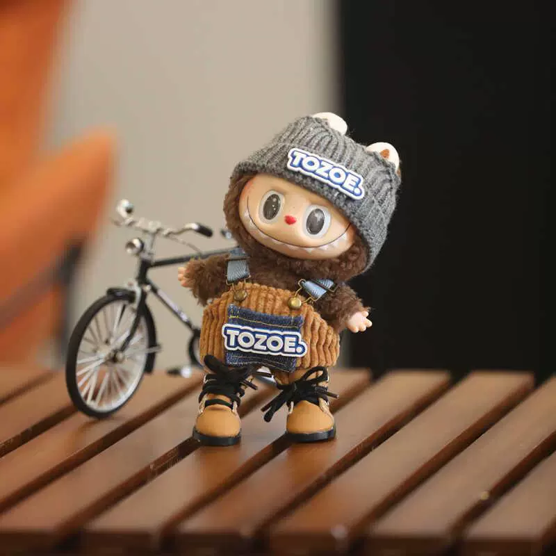 This handmade Labubu clothes set features a charming brown corduroy overall, a grey knit beanie with ‘TOZOE’ embroidery, brown patent leather shoes, and an adorable brown bear-shaped crossbody bag. Perfect for giving your Labubu doll a cozy and stylish look. Ships in 1-3 business days with guaranteed delivery within 7-15 days.