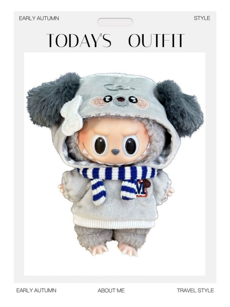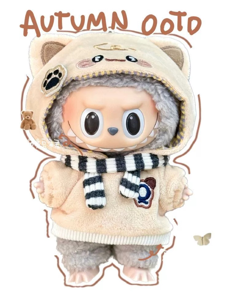 Adorable casual outfits for your 15cm Labubu doll, featuring cute puppy and kitten themes. Options include a beige hooded sweater with bear ears and paw prints, paired with a striped scarf. Perfect for a cozy and charming look. (Clothes only, doll not included).