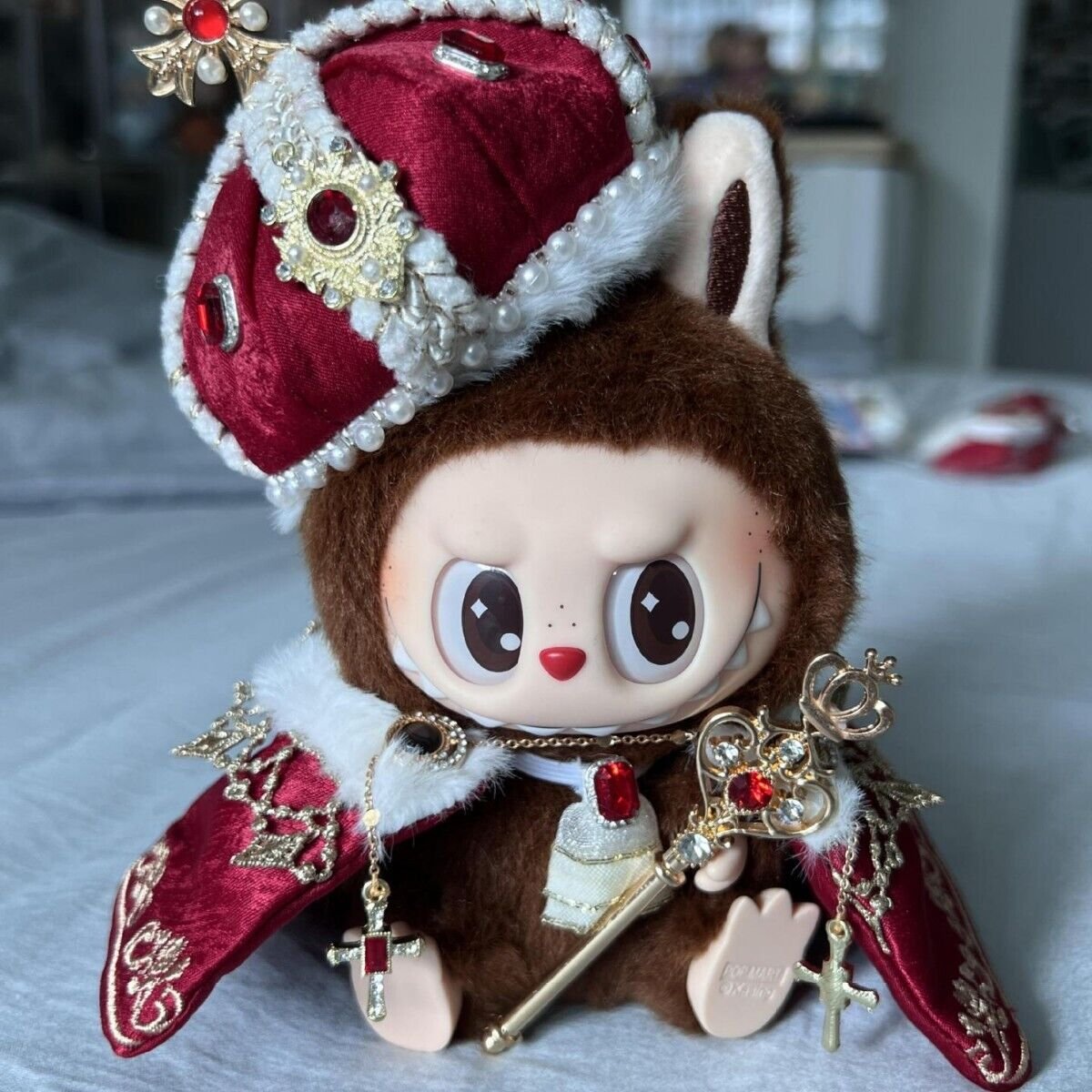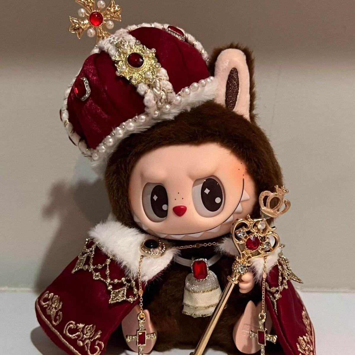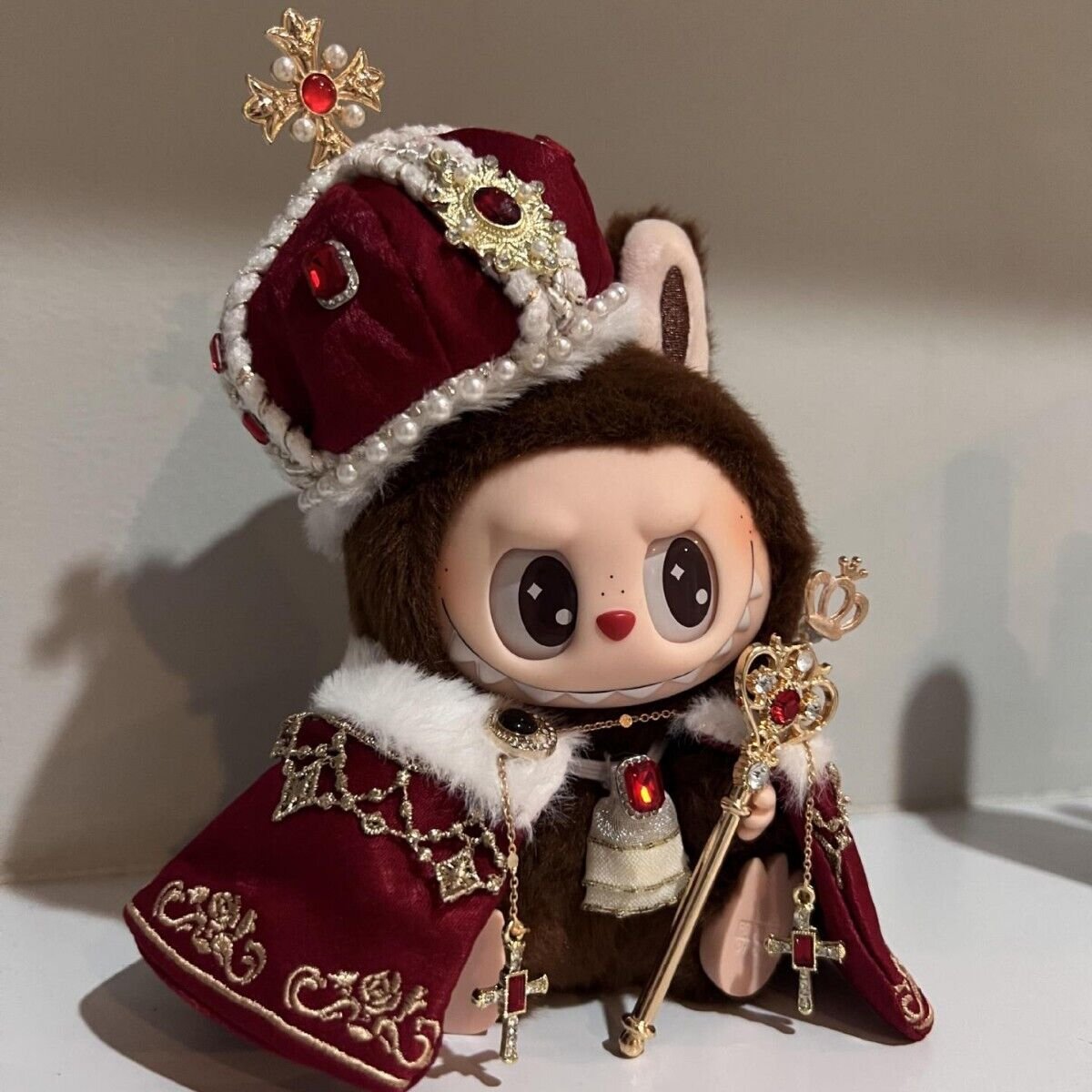 Transform your Labubu The Monsters plush doll into royalty with this DIY Court King’s Cloak Fancy Dress set, featuring a regal red and gold cloak, crown, and scepter. Perfect for imaginative play and display. (Note: Doll not included).