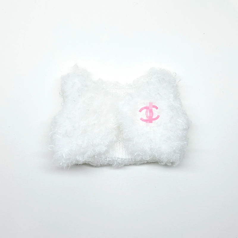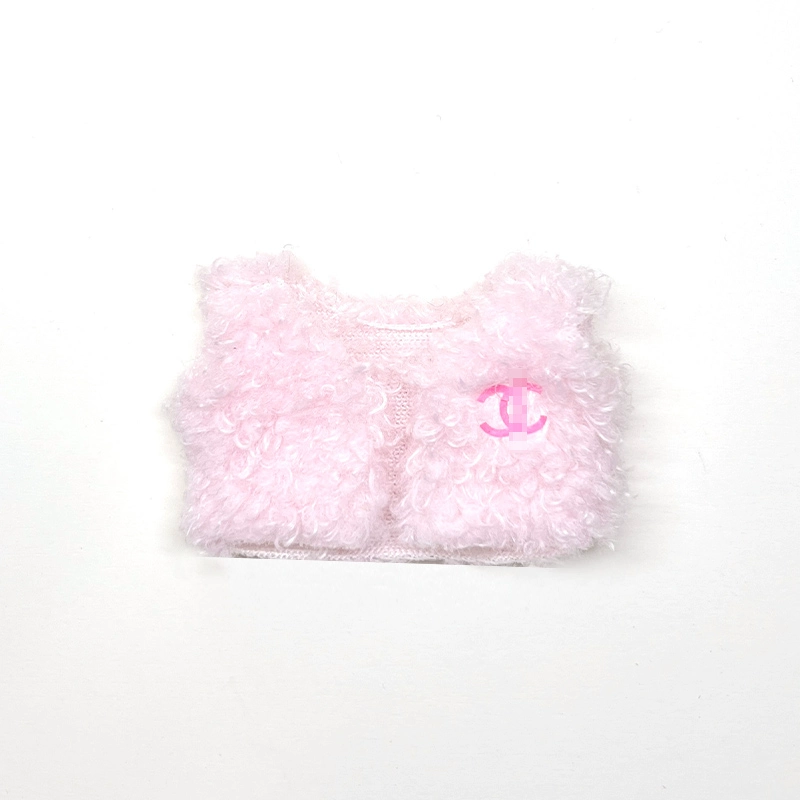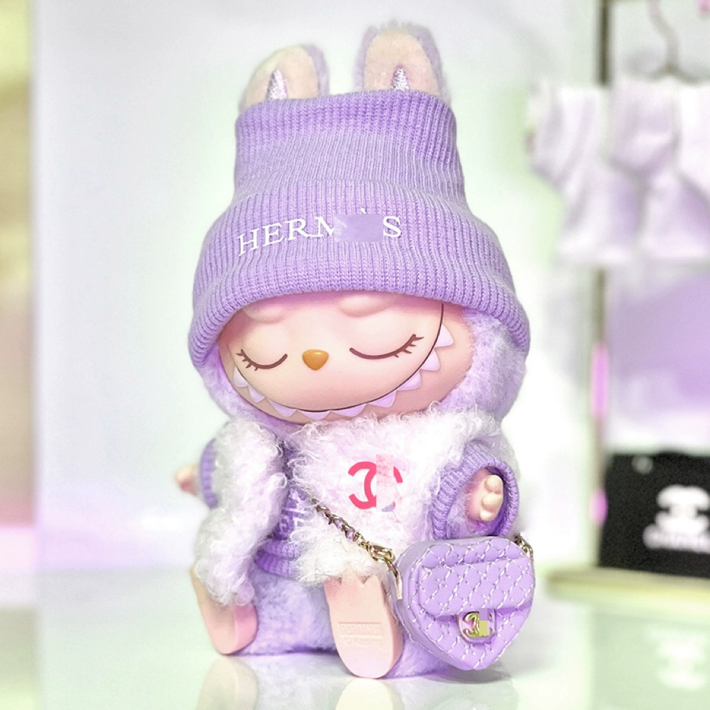 Pamper your Labubu doll with this luxurious and adorable fluffy jacket set. The main image showcases a pink fluffy jacket, a pink Chanel-style sweater, a pink beanie with rabbit ears, pink glasses, a charming pink heart-shaped bag, and a silver necklace. This set is also available in black, purple, and white, with various accessories like bags, vests, glasses, and necklaces to mix and match.