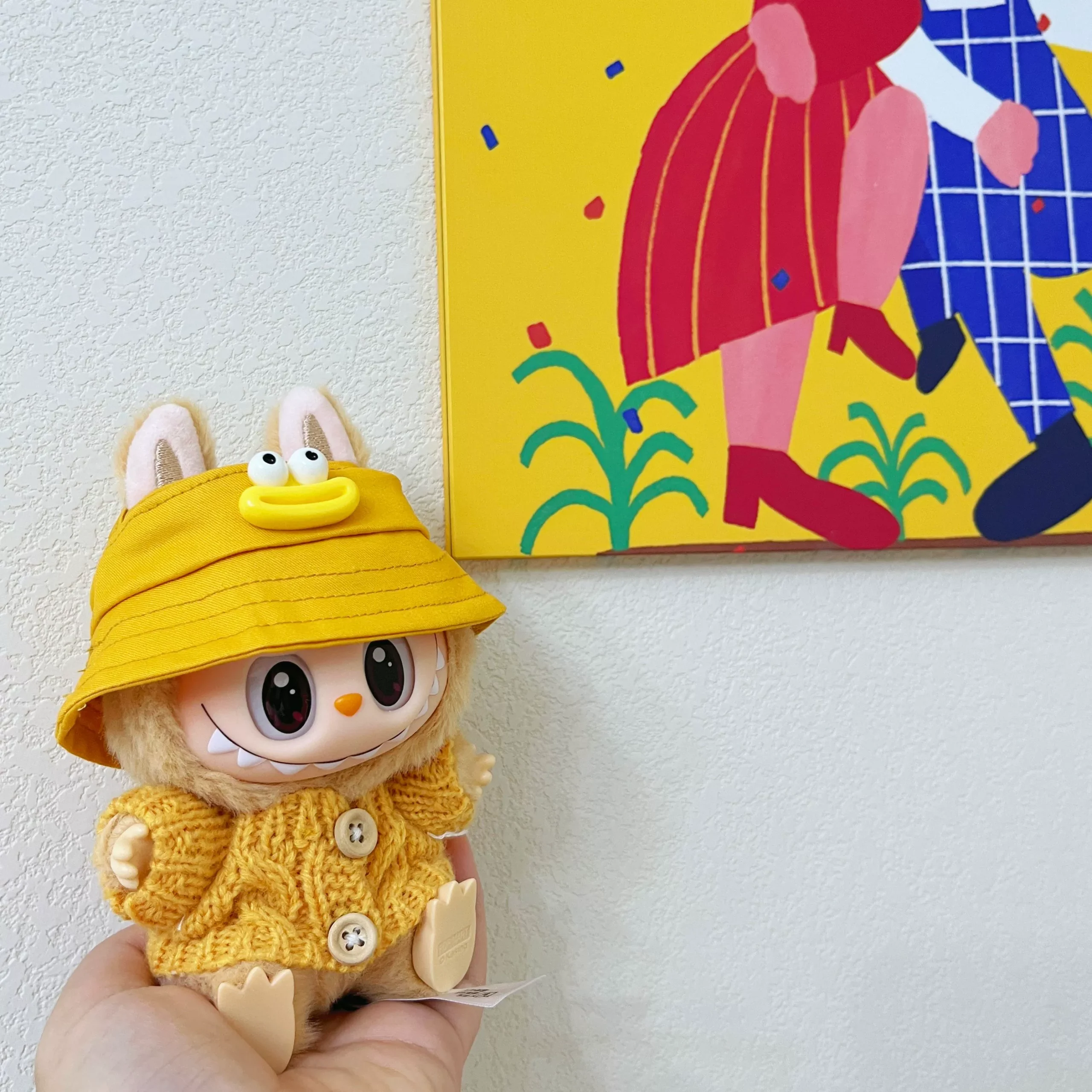 Prepare your Labubu doll for an adventure with this cute travel suit, featuring a funny yellow fisherman hat with a duck ornament and a matching knitted sweater. (Clothes only, doll not included).
