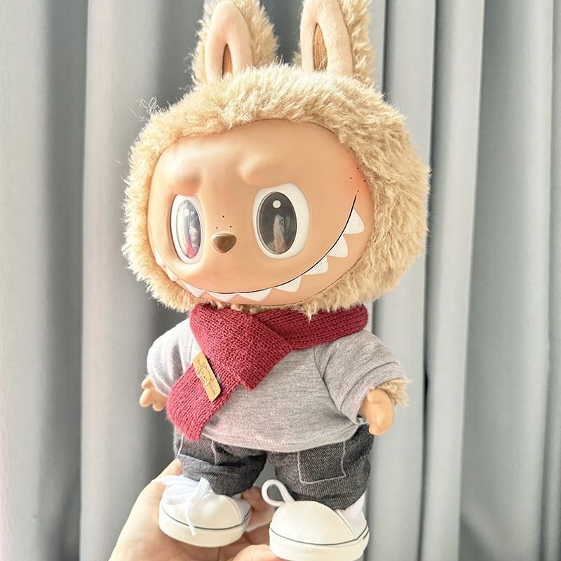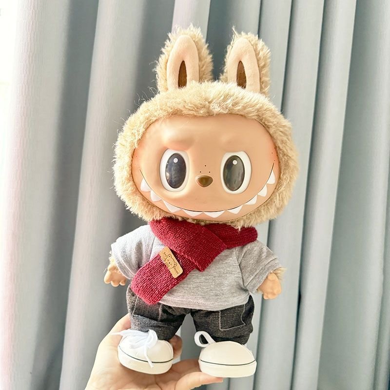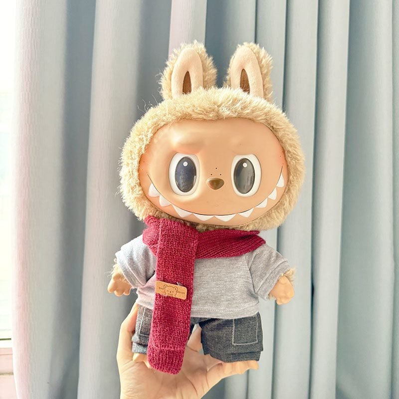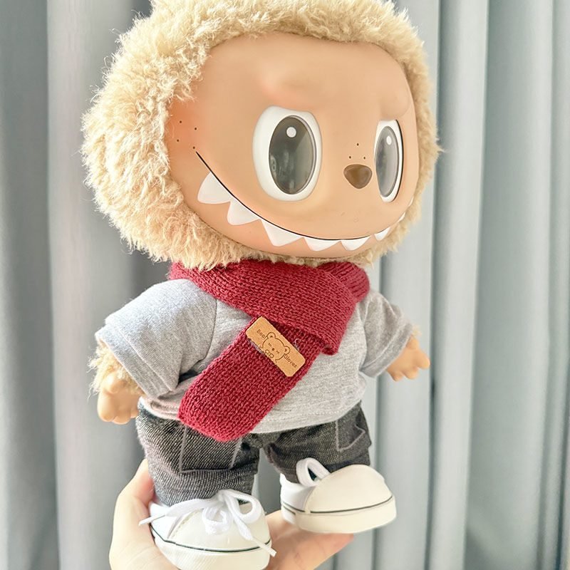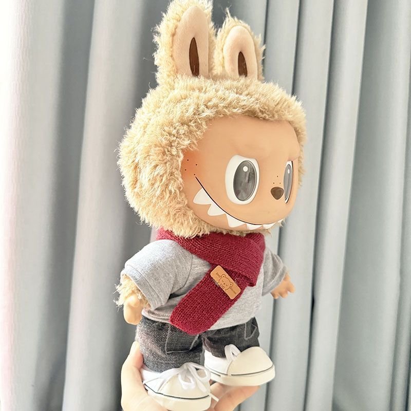 Dress your 38cm POPMART Labubu The Monsters plush doll in this handsome DIY outfit, featuring a grey t-shirt, dark pants, white shoes, and a stylish red scarf. (Note: Doll not included).