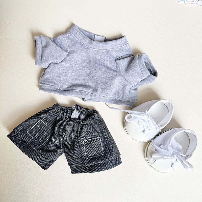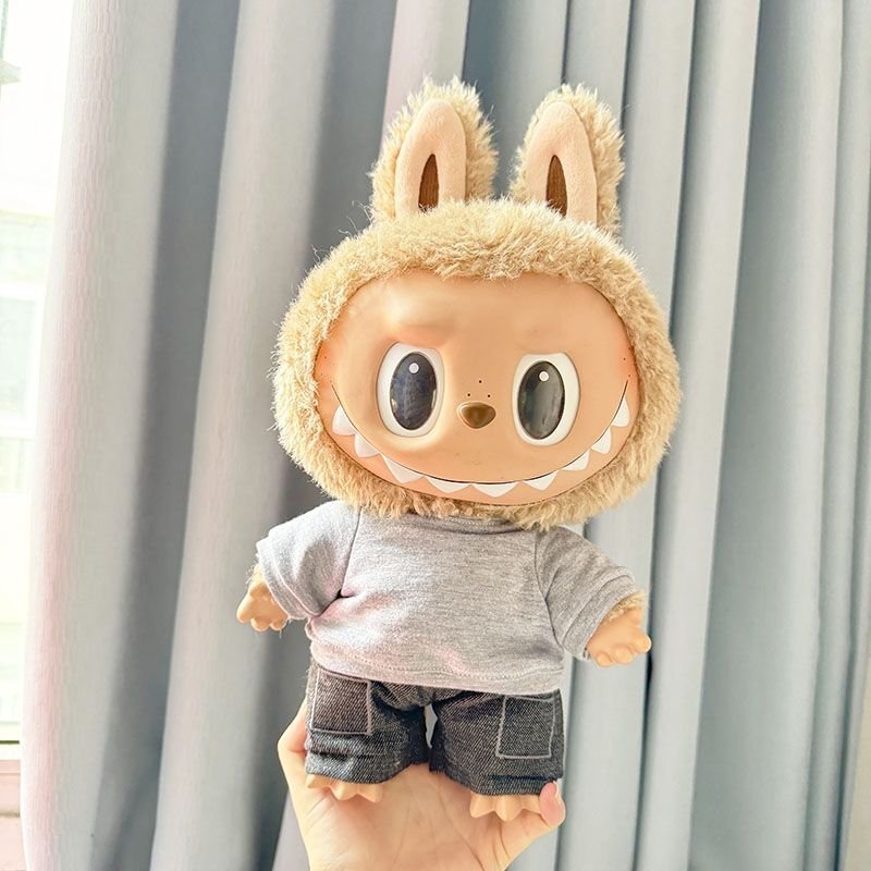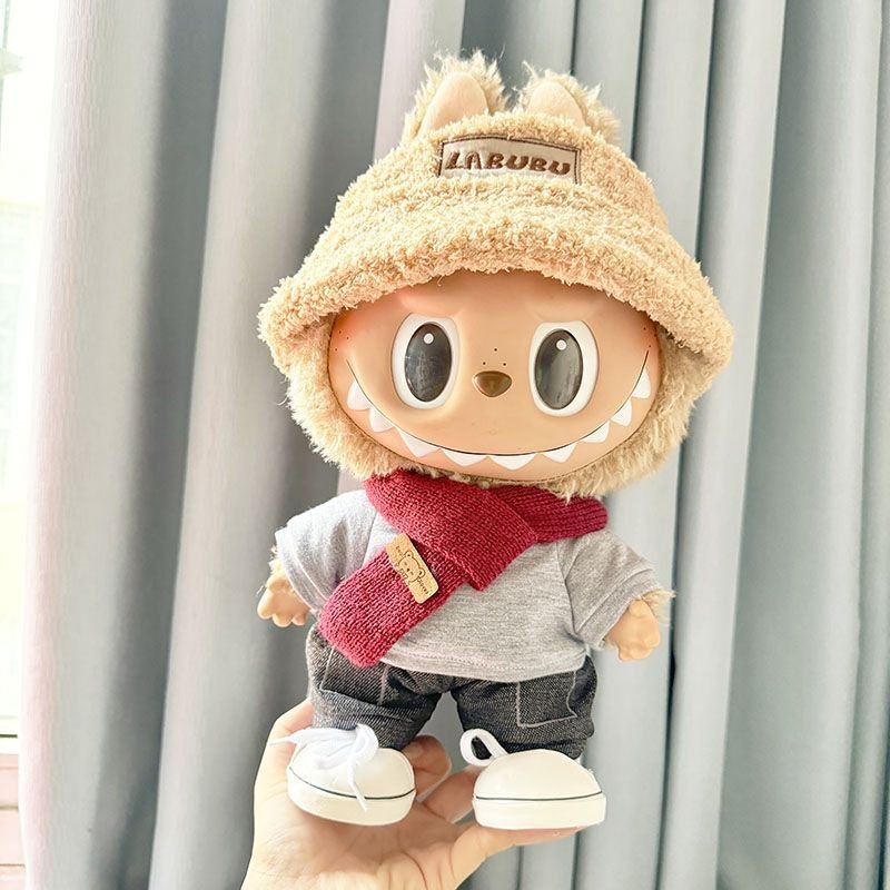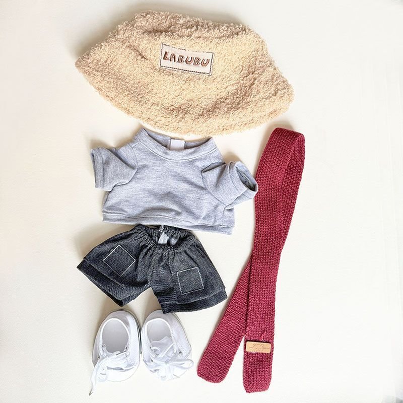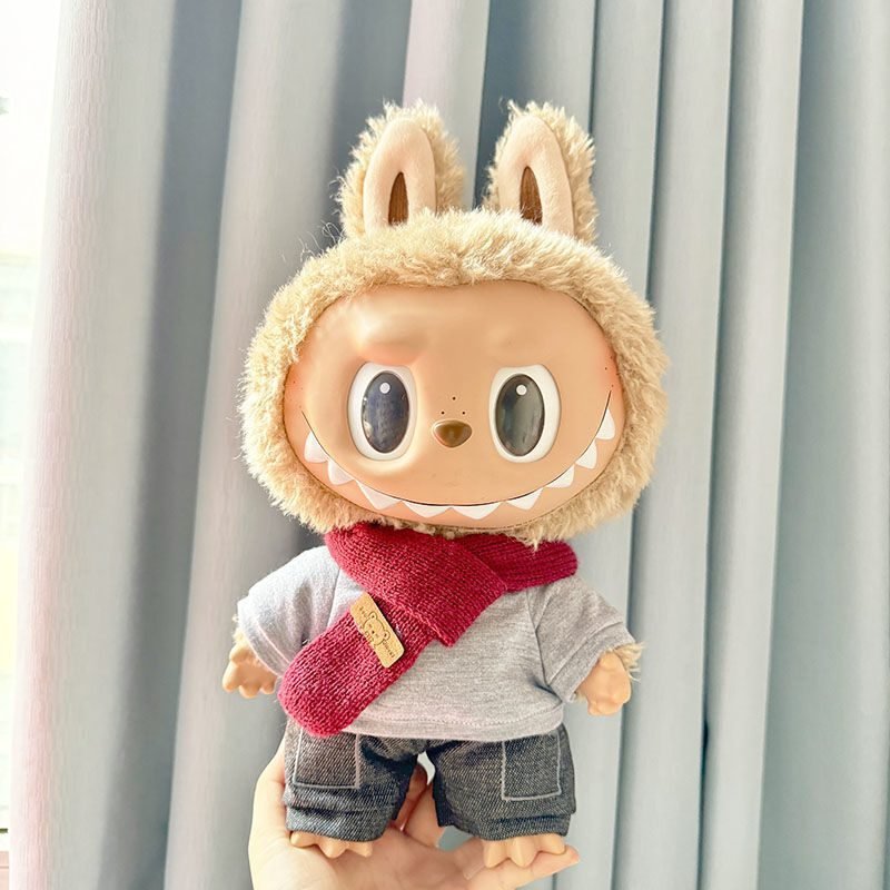 Dress your 38cm POPMART Labubu The Monsters plush doll in this handsome DIY outfit, featuring a grey t-shirt, dark pants, white shoes, and a stylish red scarf. (Note: Doll not included).