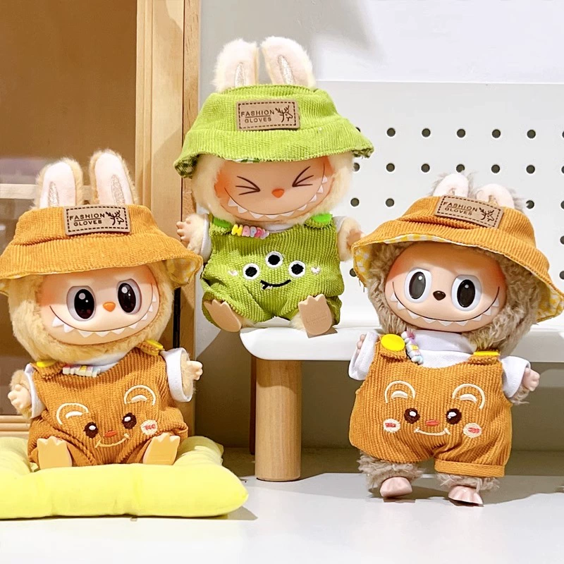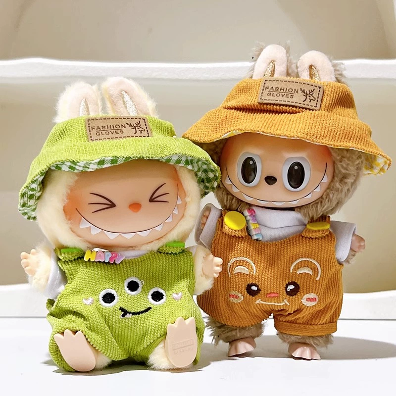 Dress your Labubu doll in these adorable handmade corduroy overalls and matching bucket hat sets. Choose between a charming brown set with ‘FASHION GLOVES’ detailing or a playful green frog-themed outfit. Both styles are designed to fit Gen 1, 2 & 3 Labubu dolls, offering a cozy and stylish look for your collection.