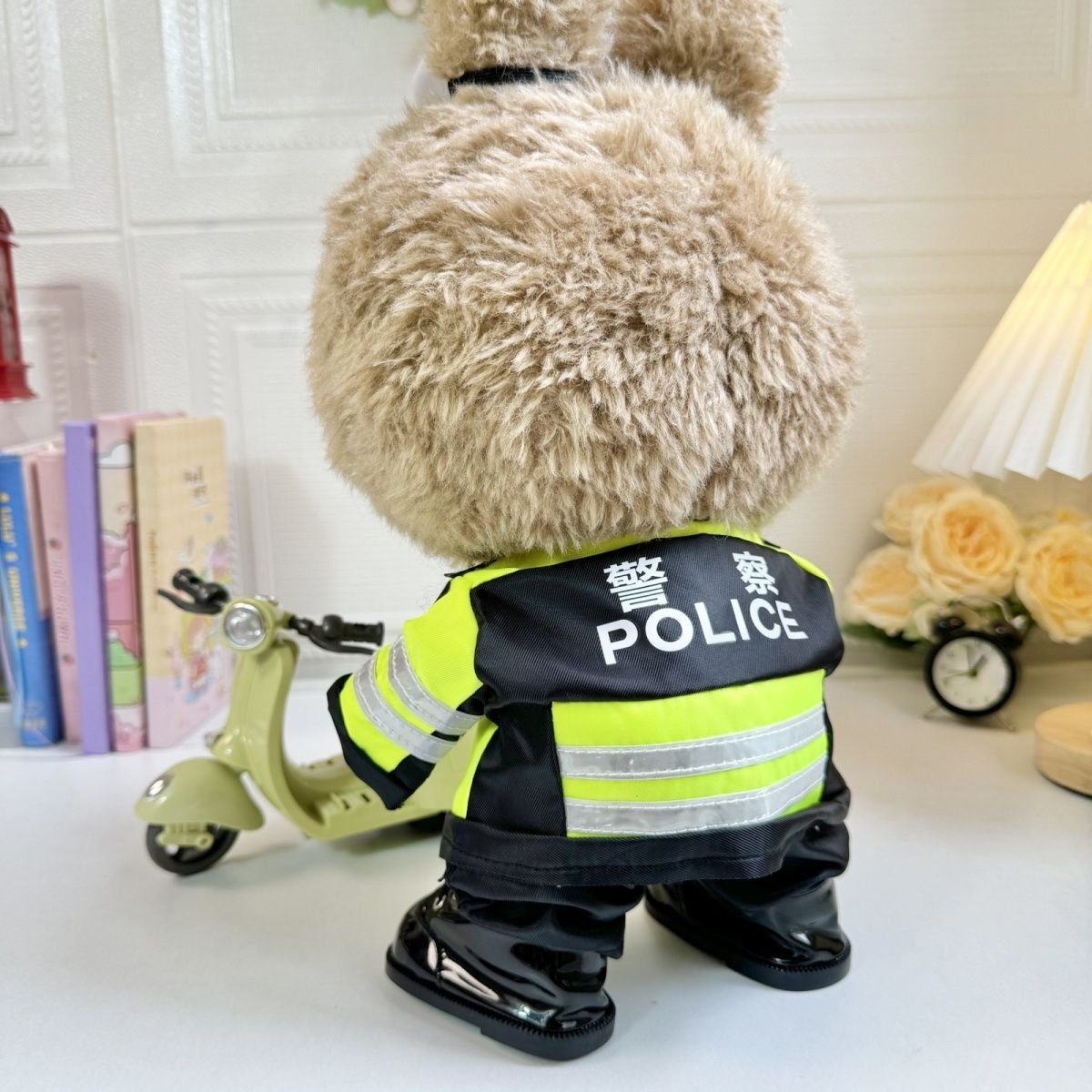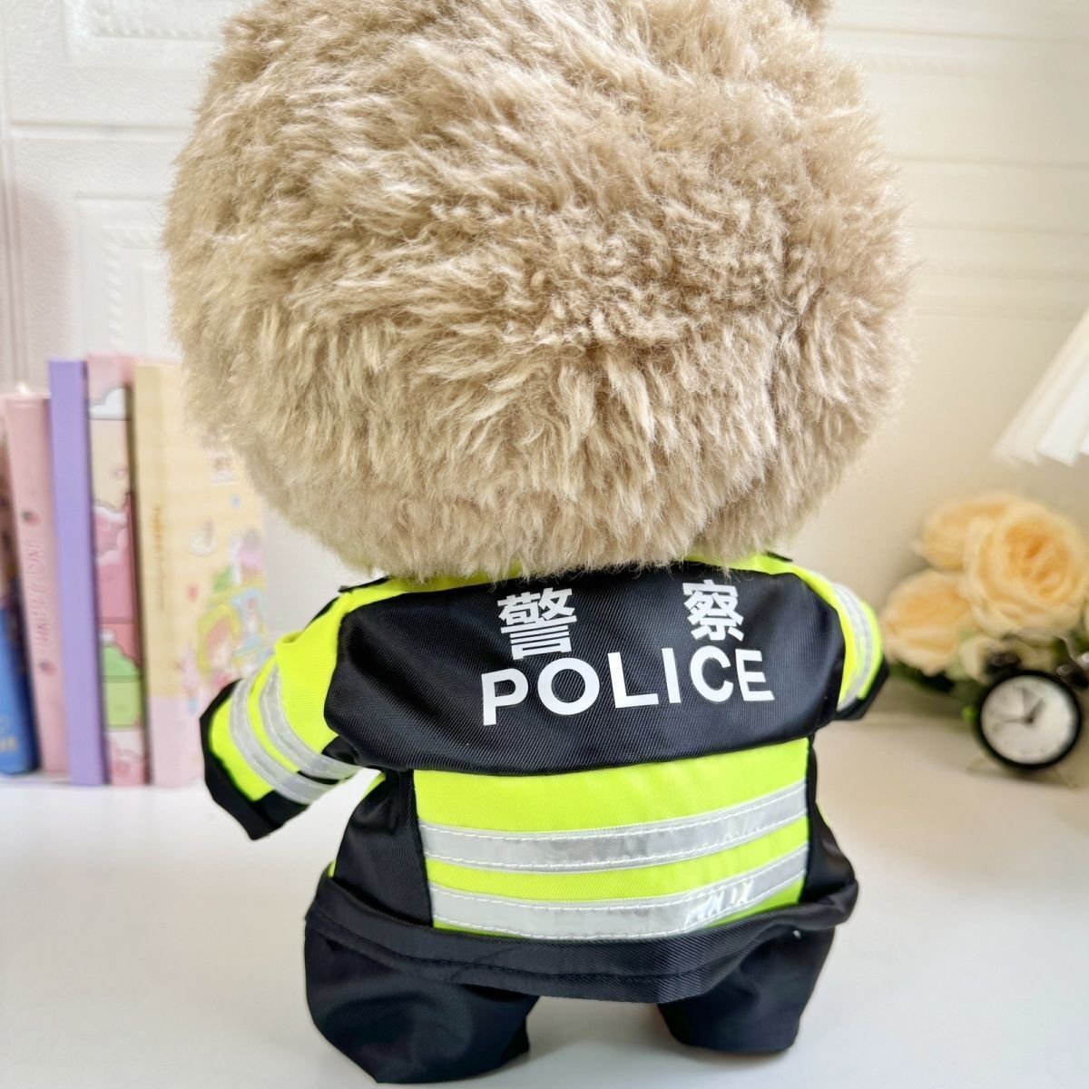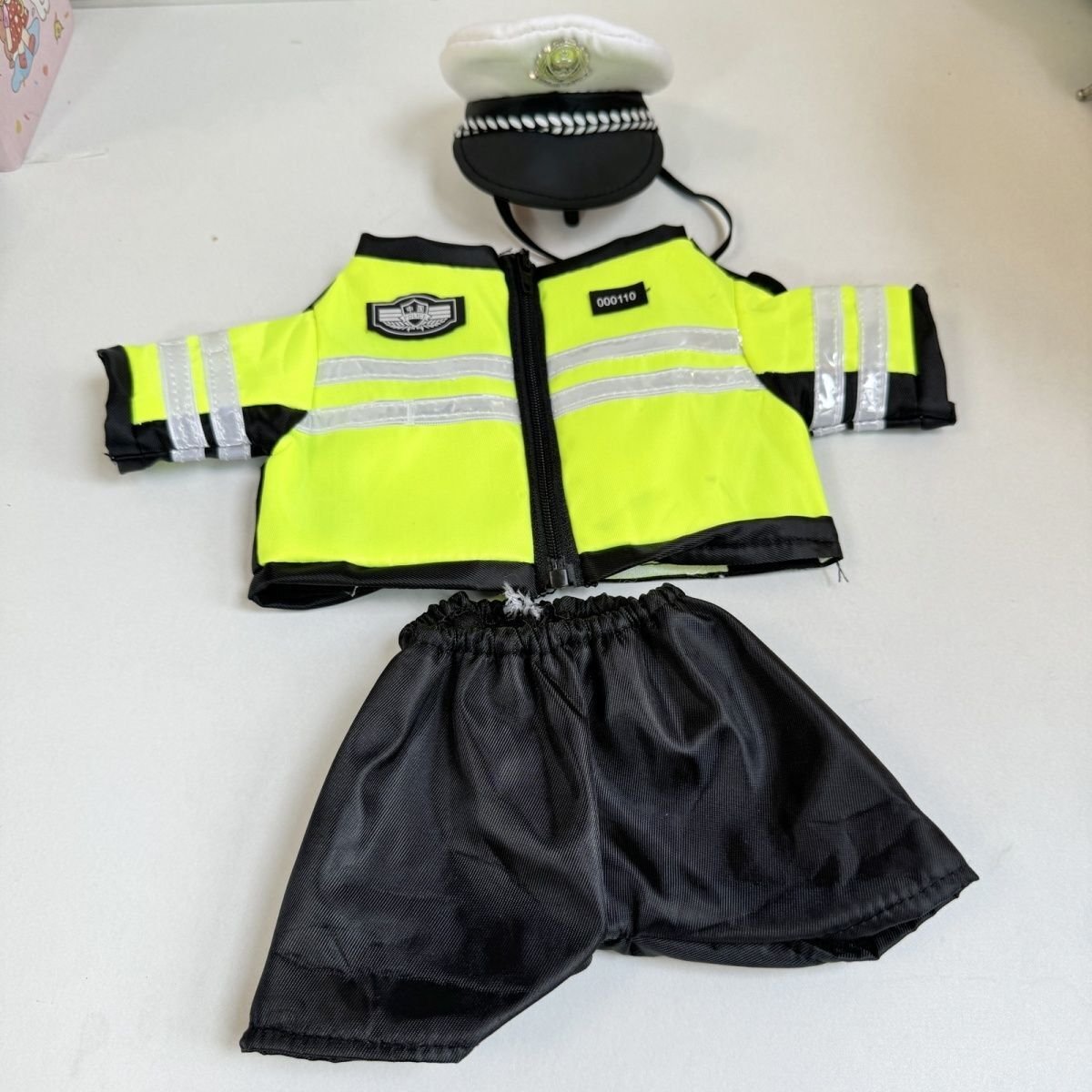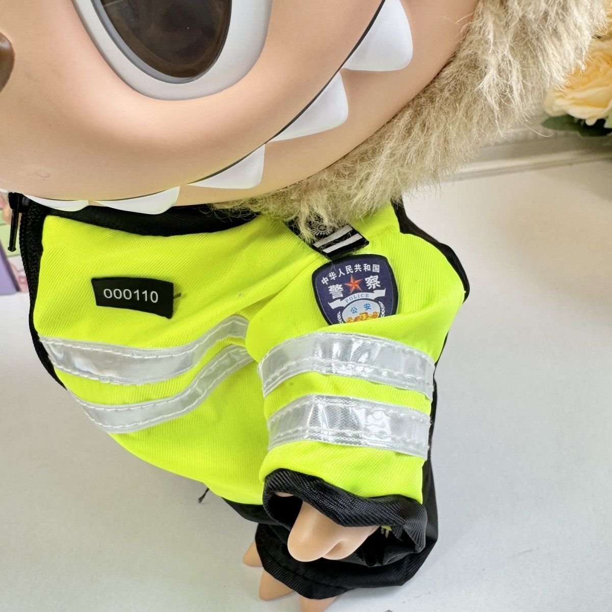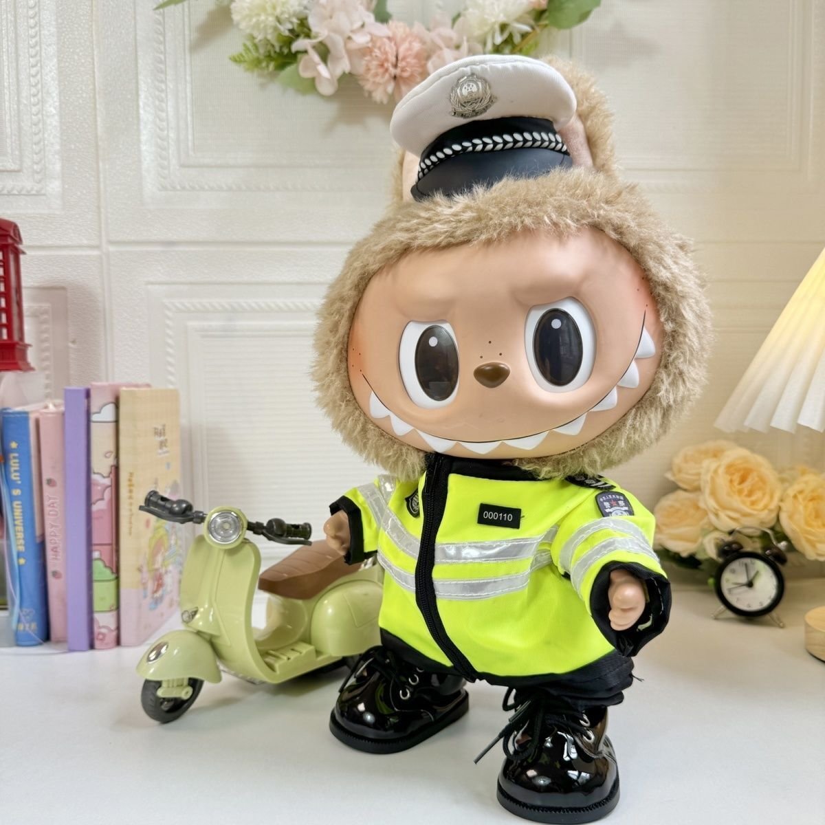 Dress your 38cm POPMART Labubu The Monsters plush doll in this cool DIY handsome police uniform set, featuring a neon green jacket with reflective strips and a police hat. (Note: Doll not included).