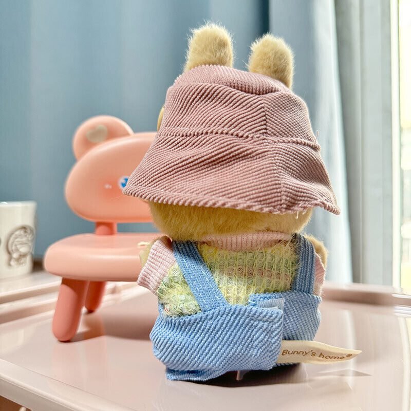 Dress your POP MART The Monsters Labubu doll in this charming pink corduroy jumpsuit and matching hat set, featuring a ‘love’ patch and star accent. (Note: Doll not included).
