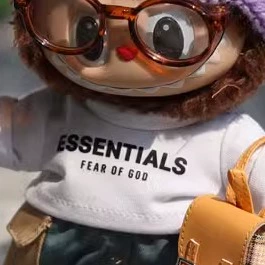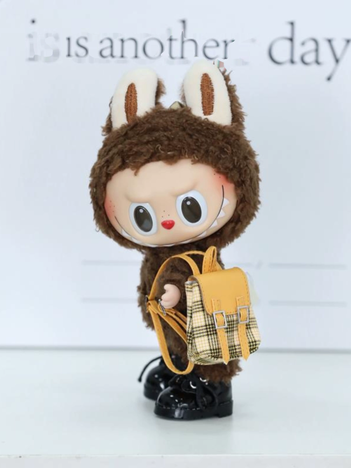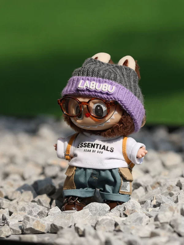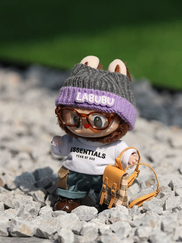 This handmade clothes set for Labubu dolls features a stylish purple-grey hat with ‘LABUBU’ text, trendy leopard print glasses, a classic white ‘ESSENTIALS’ t-shirt, contrasting colored work pants, brown bright leather shoes, and a charming yellow plaid school bag. (Clothes only, doll not included).