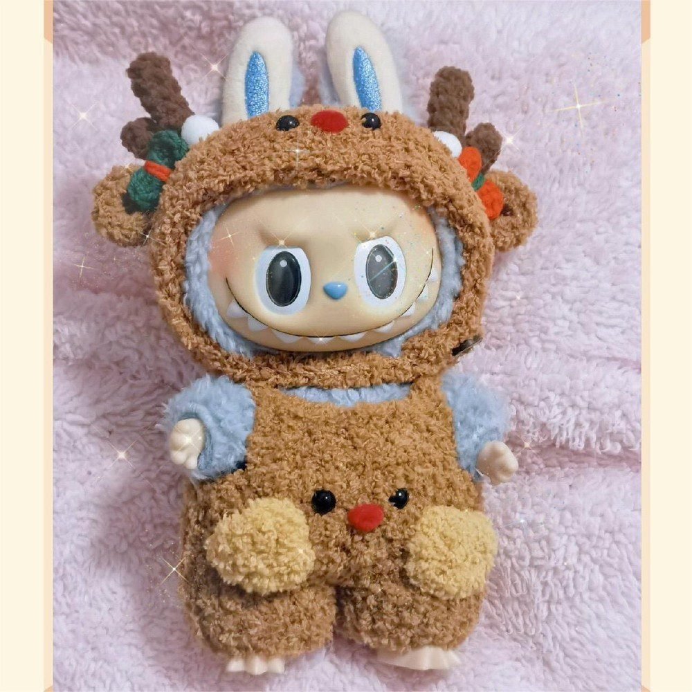 Get your Labubu doll ready for the holidays with this adorable handmade reindeer overalls set. This festive outfit features a brown reindeer-themed hooded overall with antlers, perfect for the holiday season. (Clothes only, doll not included).
