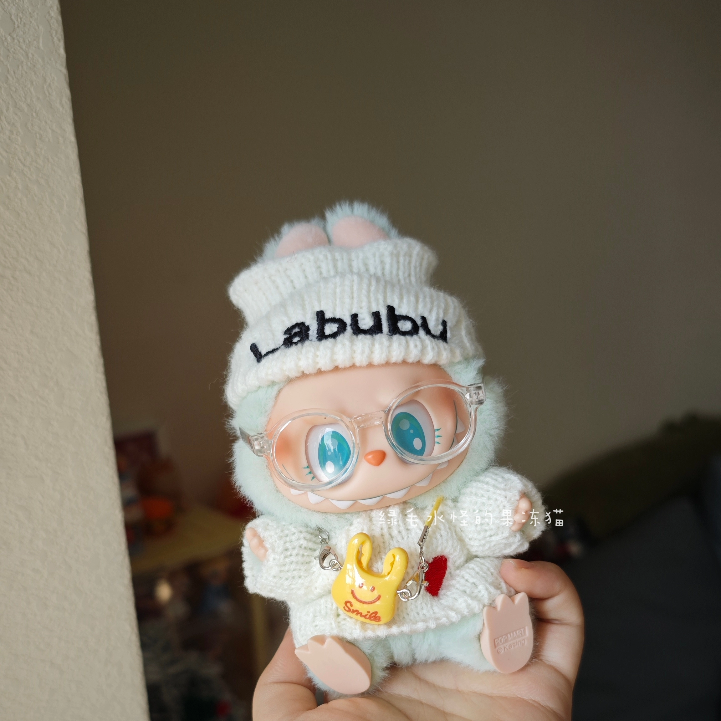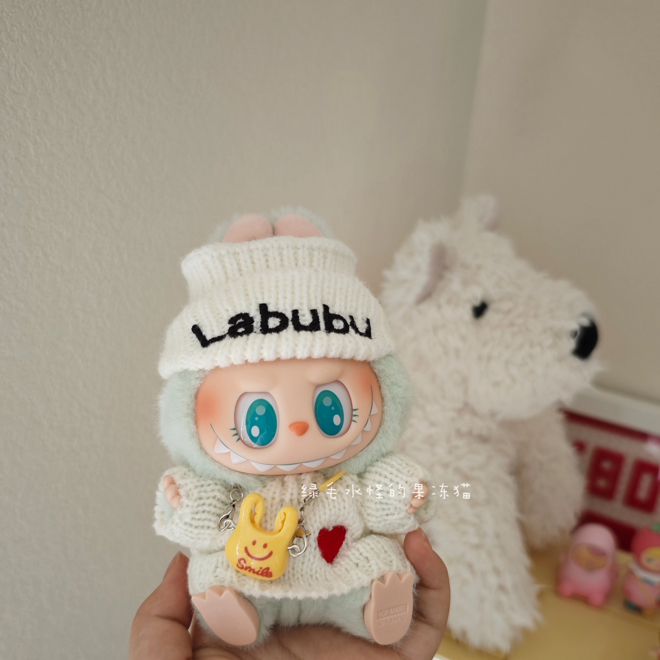 Warm and adorable handmade winter set featuring a white knitted hat with “Labubu” embroidery and a matching white sweater with a red heart. This cozy outfit is designed to fit Labubu Gen 1, 2 & 3 dolls, perfect for the colder seasons.