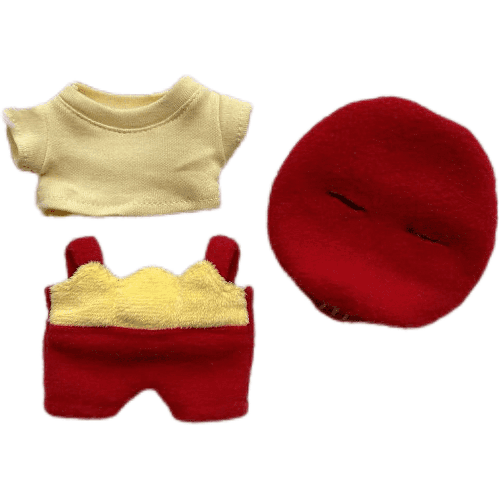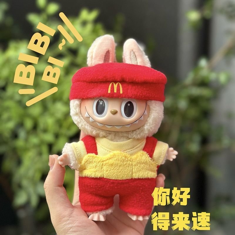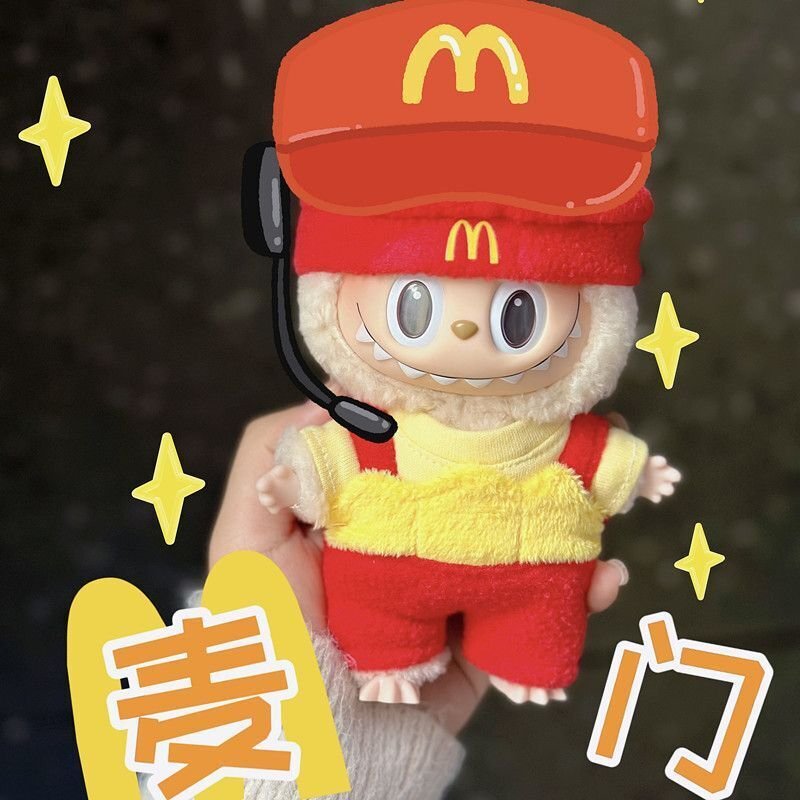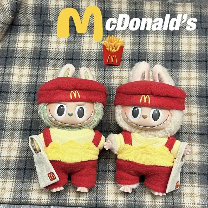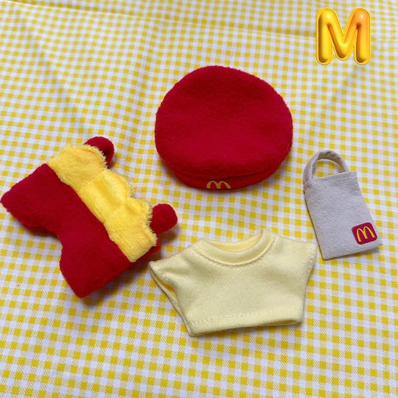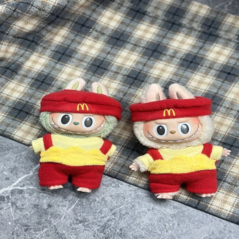 Fun POP MART Labubu McDonald’s themed clothes and hats set, featuring a vibrant red and yellow design with a matching bag. This playful outfit is designed to fit Labubu Gen 1, 2 & 3 dolls, perfect for adding a unique touch to your collection.