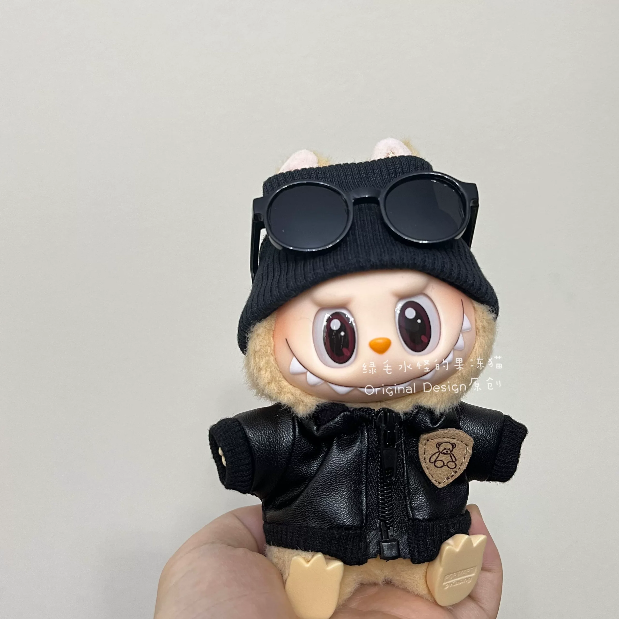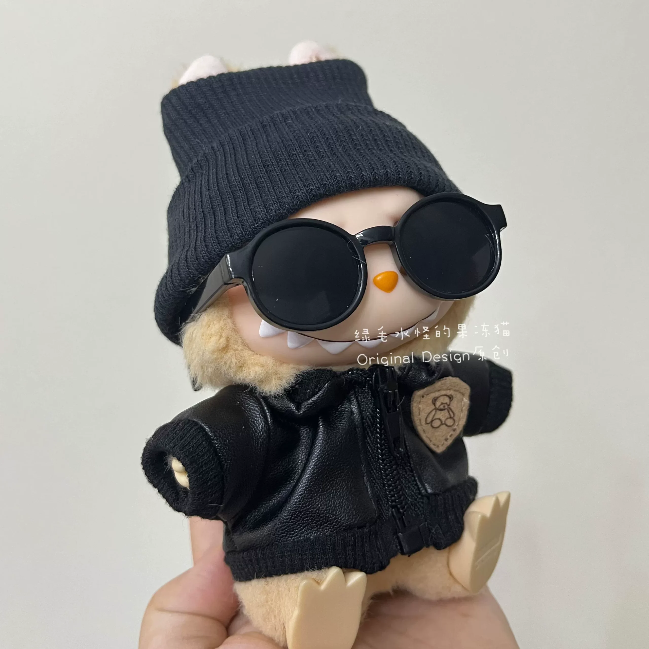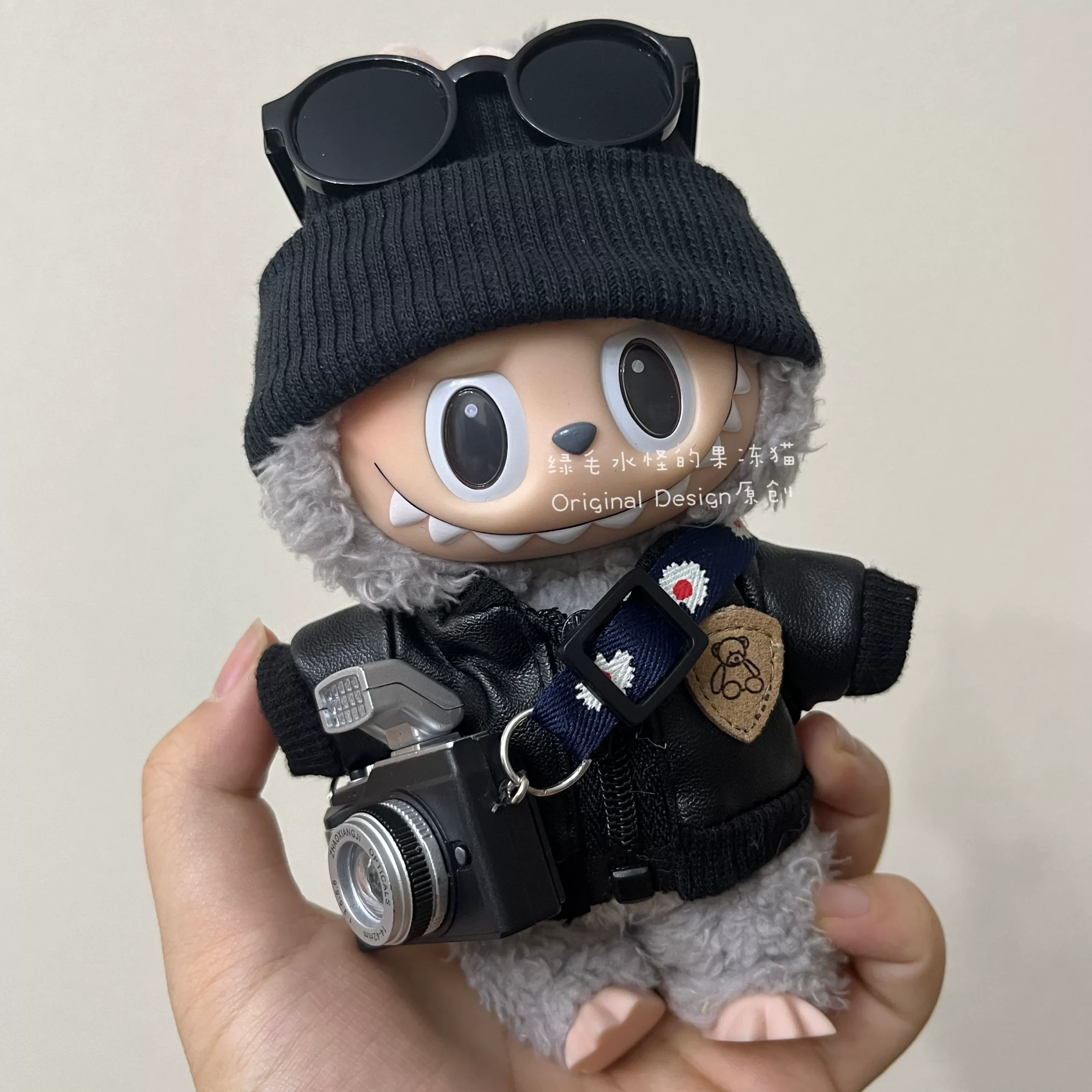 Cool and trendy handmade motorcycle leather outfit for your Labubu doll, complete with a black knitted hat, stylish sunglasses, and a camera-shaped crossbody bag. This set is designed to fit Labubu Gen 1, 2 & 3 dolls, perfect for a bold and adventurous look.