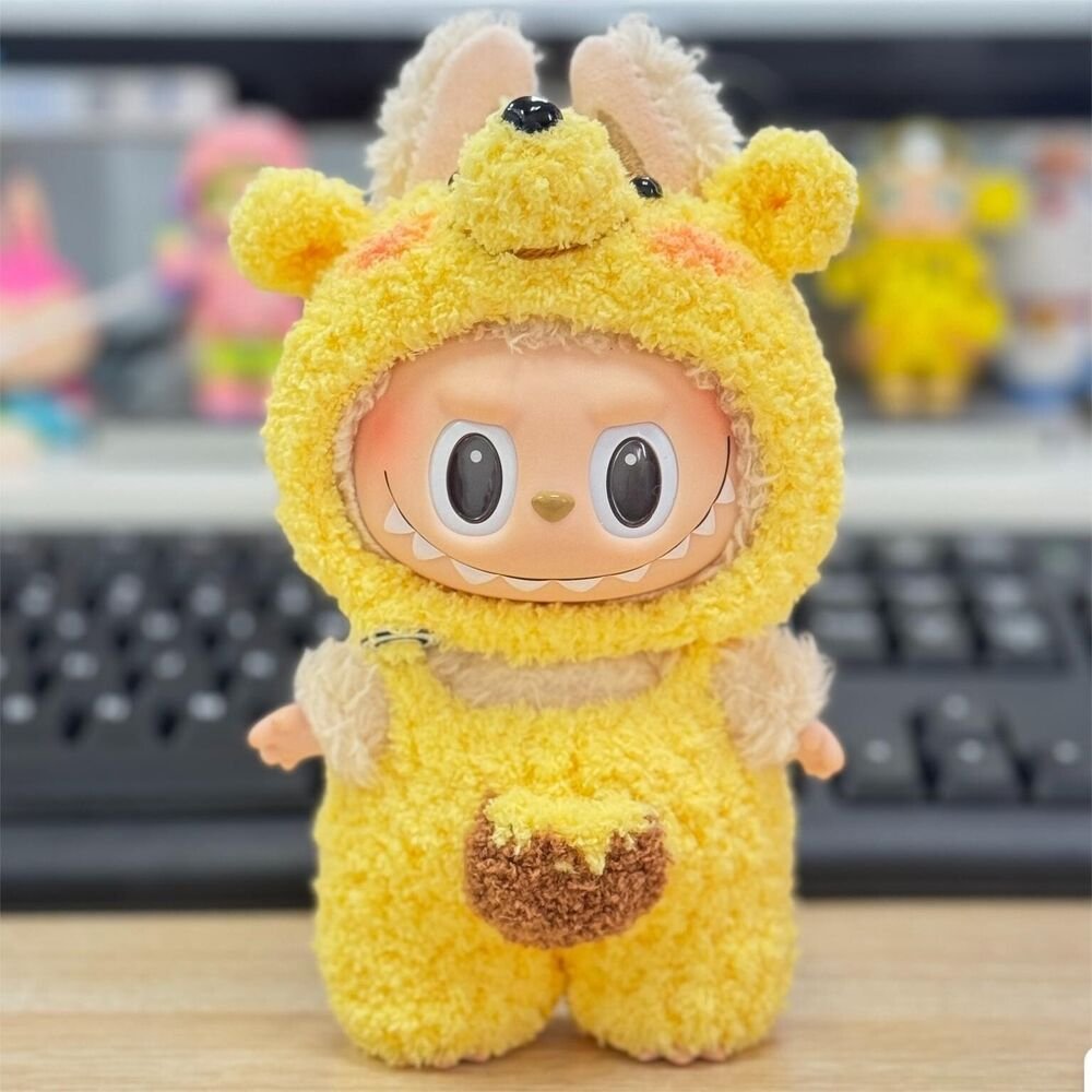 Cute handmade yellow bear jumpsuit with a honey pot accent, perfect for your Labubu The Monsters plush doll. This charming outfit is designed to fit Labubu Gen 1, 2 & 3 dolls, bringing a playful look to your collection.