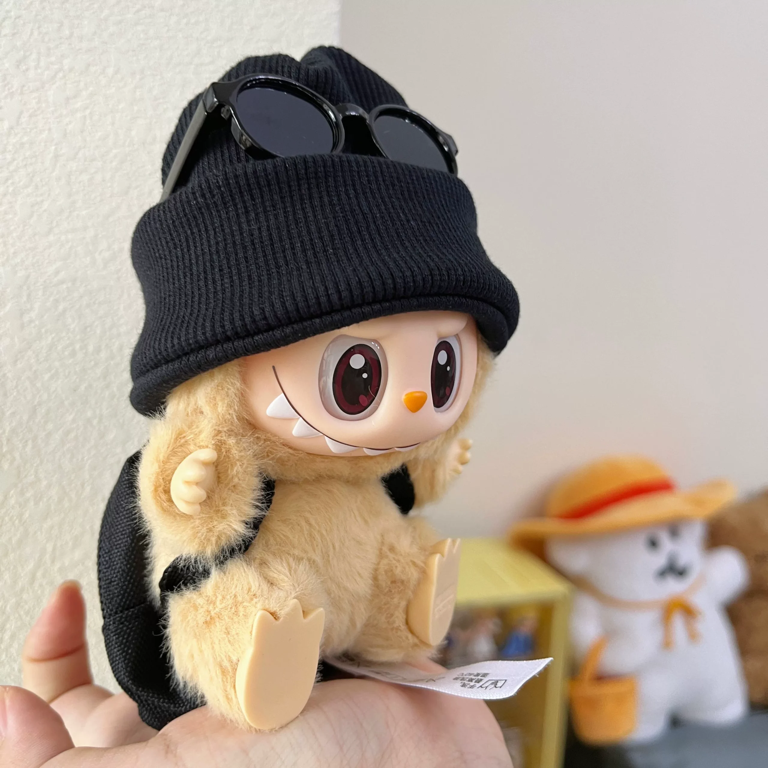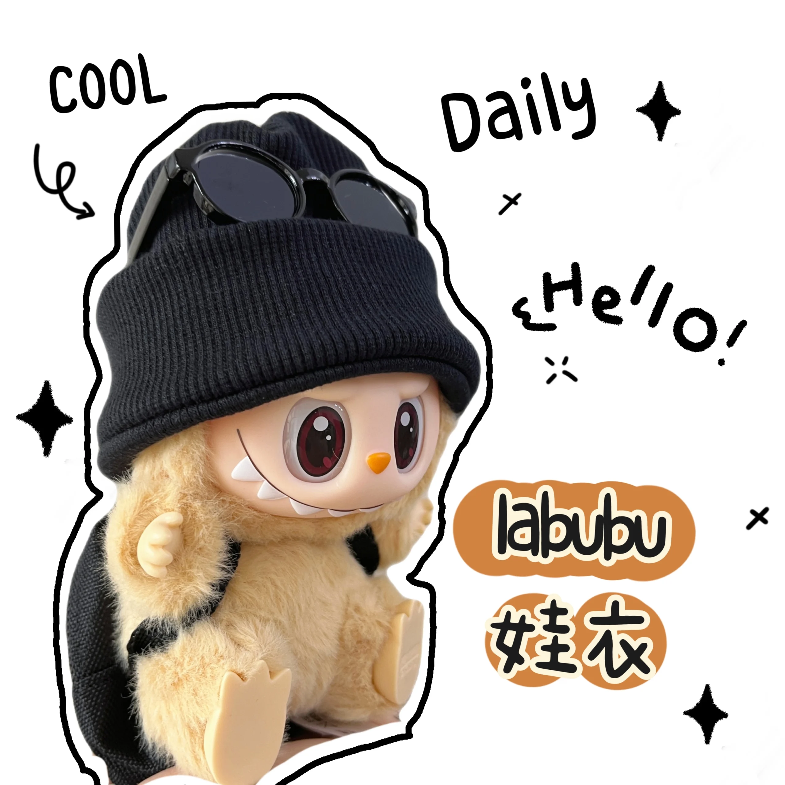Elevate your Labubu doll’s style with this trendy black cold hat, sunglasses, and backpack set. Perfect for creating a cool and fashionable look. Various combinations are available. (Clothes only, doll not included).