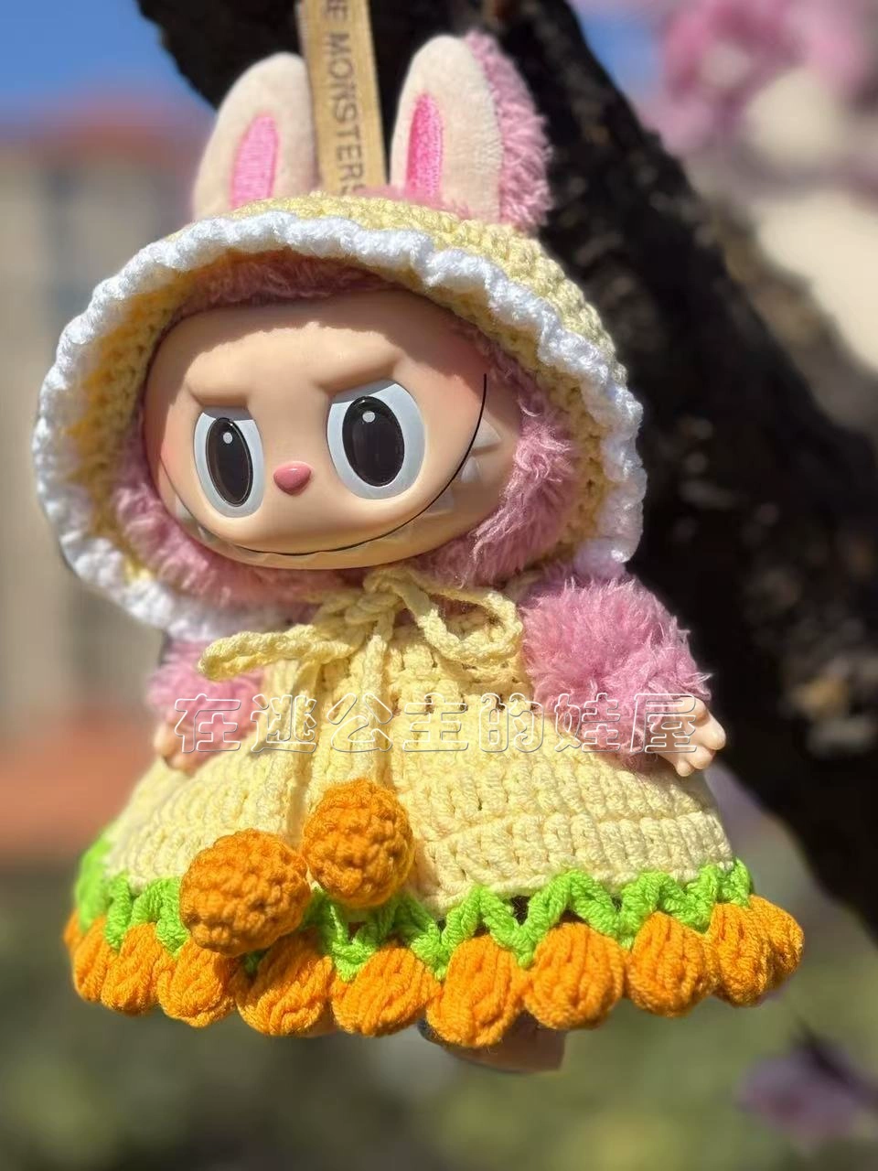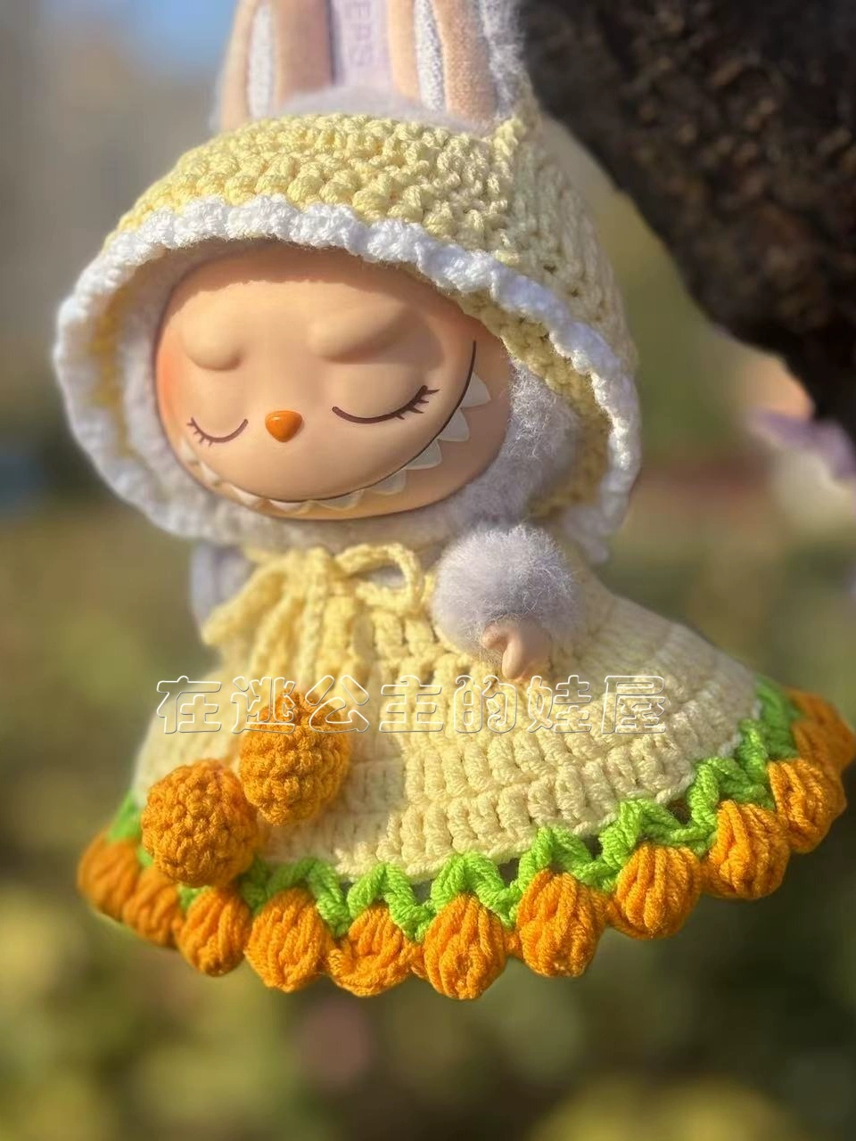 Adorn your Labubu doll in this charming pure hand-crochet yellow tulip dress suit. This delightful outfit features a hooded yellow dress with green accents and orange tulip-like embellishments, perfect for a fresh and vibrant look. (Clothes only, doll not included).