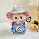 Dress your Labubu plush doll in this charming handmade denim overalls and striped shirt set. This classic outfit features blue denim overalls with a cute bear patch, a red and white striped shirt, and a matching bucket hat, perfect for a casual and adorable look. Please note, the product only includes clothing, not the doll.
