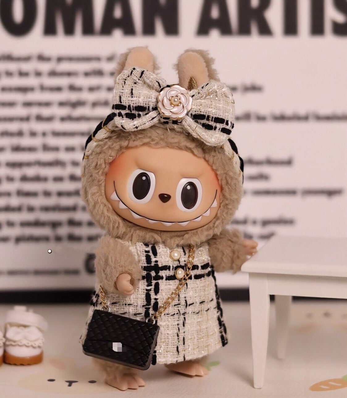 Dress your Labubu doll in this chic handmade tweed coat, complete with a matching bow headband and a mini handbag. This elegant outfit is perfect for a sophisticated and fashionable look. Clothes only, doll not included.