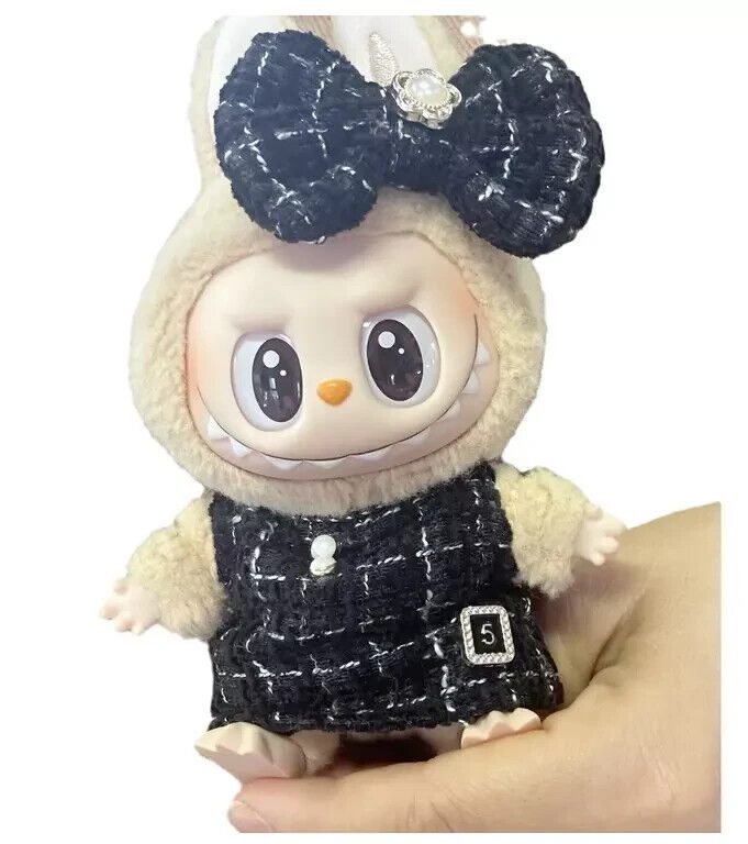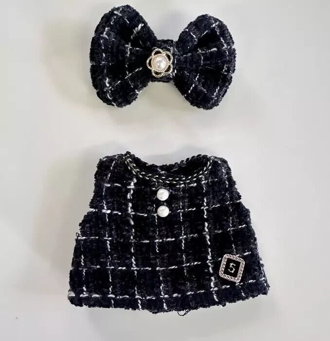 Elevate your Labubu doll’s style with this chic handmade tweed dress set. Featuring a classic black and white tweed pattern and a large black bow on the head, this outfit is perfect for 15-17cm collectible dolls. (Clothes only, doll not included ).