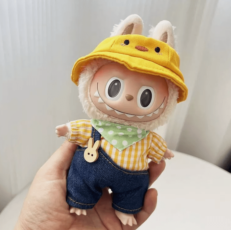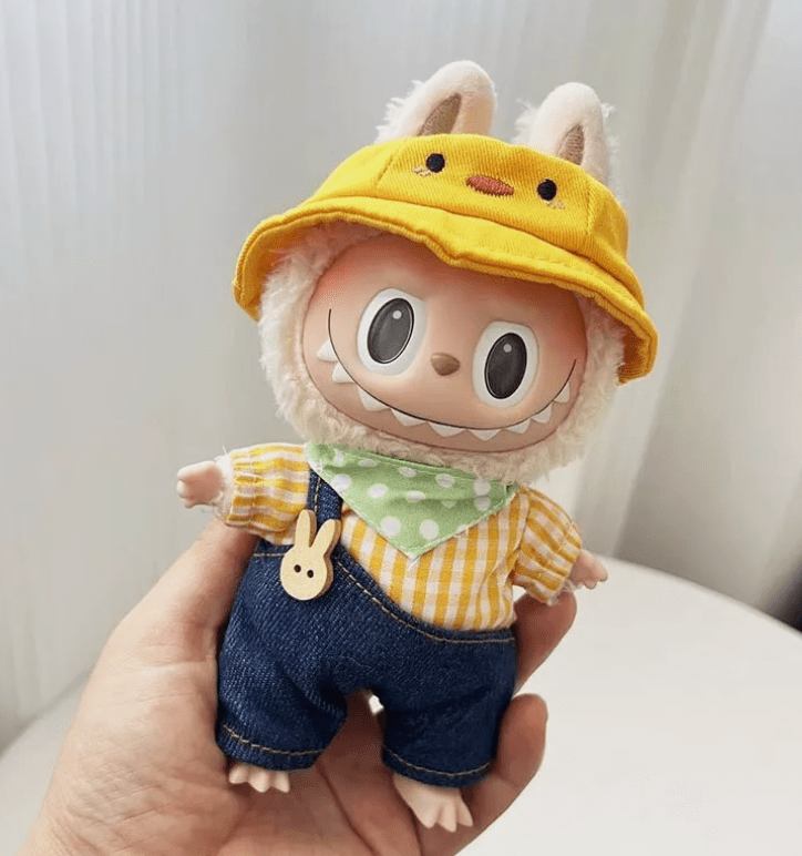 Dress your Labubu doll in this charming yellow plaid shirt and denim overalls set, complete with an adorable yellow duck hat. This handmade outfit features a playful and casual style, perfect for everyday adventures. The bright yellow and classic denim create a fresh and lively look, making it a delightful addition to any Labubu collection. (Dolls not included).